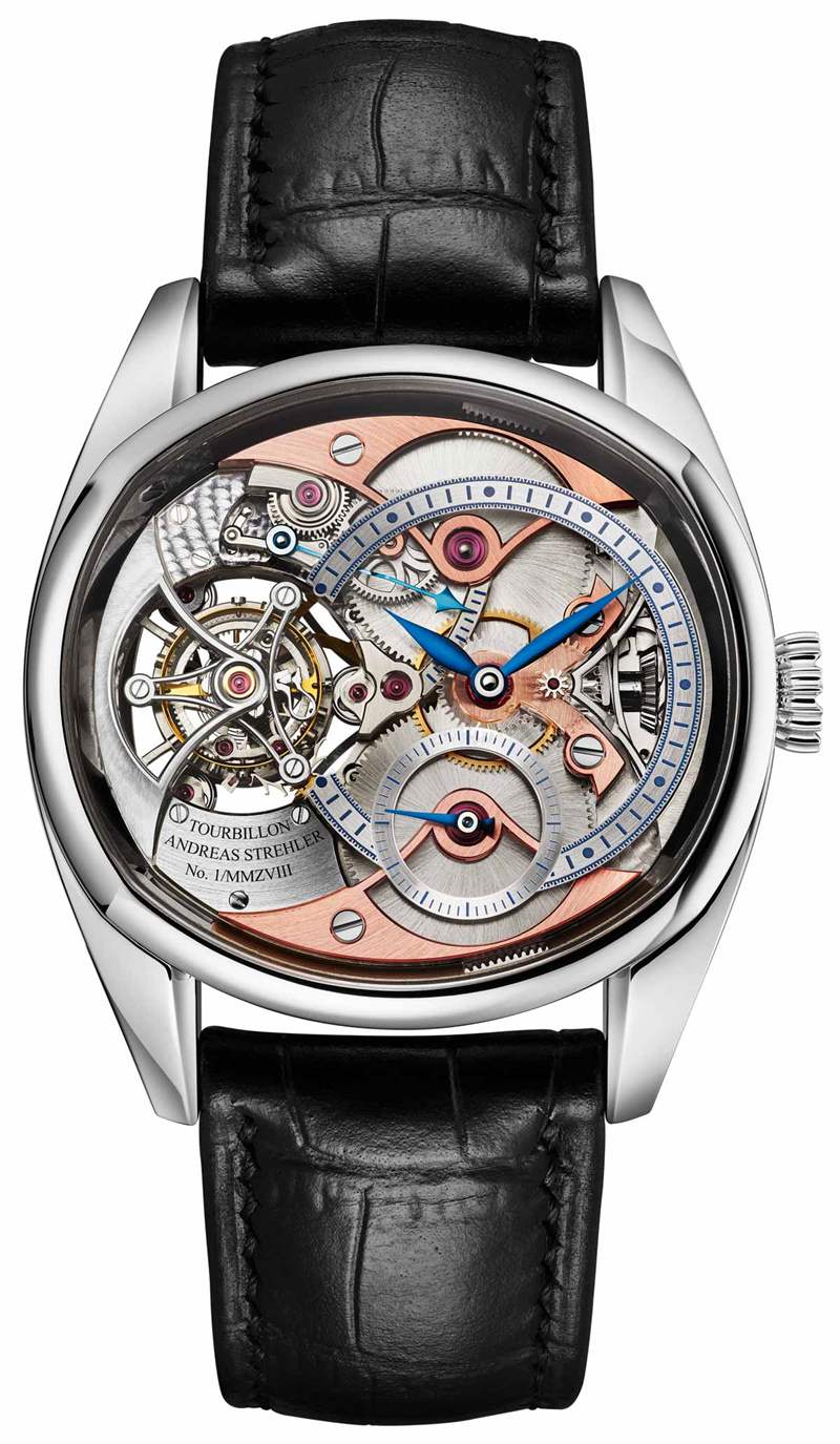 Andreas Strehler Transaxle Remontoir Tourbillon 表殼可以用金或鉑金制成,寬 41 毫米,表耳之間的距離為 47.2 毫米,厚約 10 毫米。優雅的半墊形表殼造型經典,柔和的線條與外露機芯的華麗細節相得益彰。附在表殼上的是一條鱷魚皮表帶。