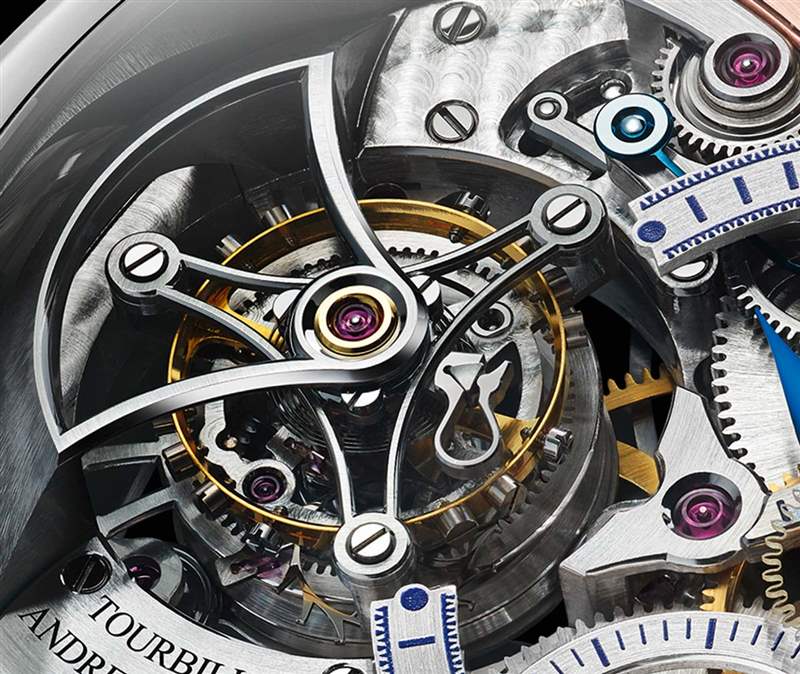 更難注意到的是動力儲存指示器,它是通過一根長長的藍色指針完成的,它從陀飛輪上方開始,到達顯示主要時間的小刻度。在兩個主發條盒之間,機芯共有 78 小時的動力儲存,工作頻率為 3Hz(21,600 bph)。Andreas Strehler 通過差速擋塊和橢圓形齒輪人為地將動力儲備限制在較低的水平。為什么?這樣做是為了當主發條中的功率太低而無法有效地為 remontoire 的操作提供動力(從而準確地為機芯提供動力)時,它就會關閉。
