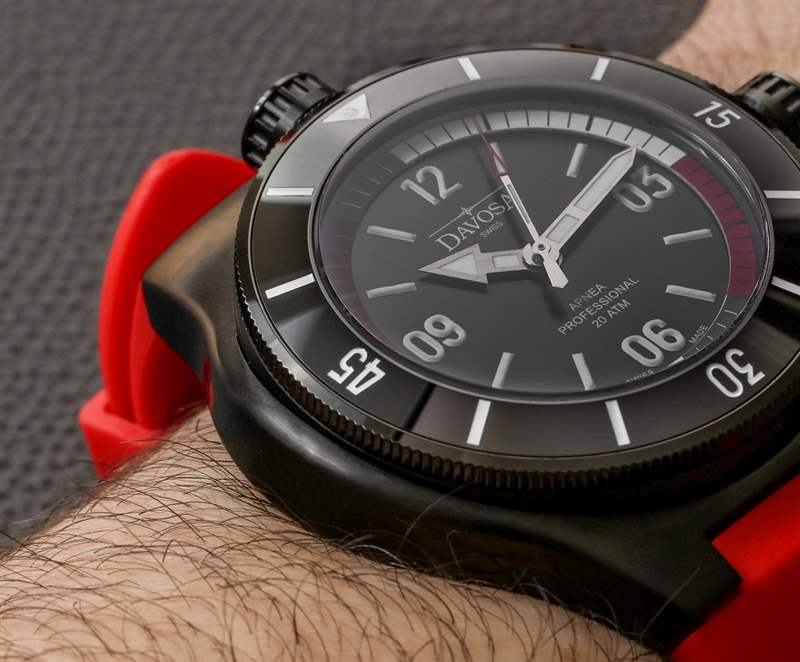 對于那些不打算用你的手表練習自由潛水呼吸技巧的人來說,有漂亮的顏色可以看,當然看起來像是一系列國旗顏色(從美國到法國等等)。Davosa 否則選擇使表盤干凈和對稱。沒有日期,由于面部比例合適,材料和對比度的使用良好,易讀性非常好。表盤本身可能不如 Apnea Diver 的整體構成那么原始,但它工作得非常好。使用刷過的指針是正確的選擇,我喜歡在時標上使用厚厚的 Super-LumiNova 涂料。外部的“呼吸暫停環”也被應用,因此它有助于給表盤一種很好的深度感。