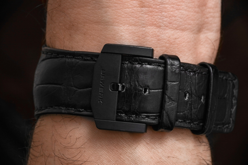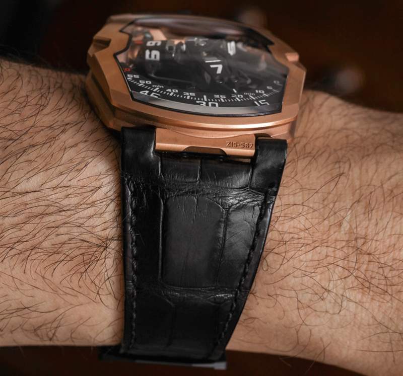 Urwerk 為我的小手腕提供了一條較短的表帶——我很感激。鑒于這條非常好看的黑色鱷魚皮表帶各個部分的厚度,我鼓勵任何對這款手表感興趣的人仔細檢查以確保隨附的表帶適合他們的手腕。如果不是這樣,佩戴體驗可能不會那么舒適。我之所以提到舒適性,是因為我認為每次表殼形狀不是帶有傳統表耳的標準圓形時,都值得一提。在這里,表耳位于表殼底部,位于主表殼下方,從人體工程學的角度來看,這有助于使手表保持正面。廣告訊息廣告信息結束