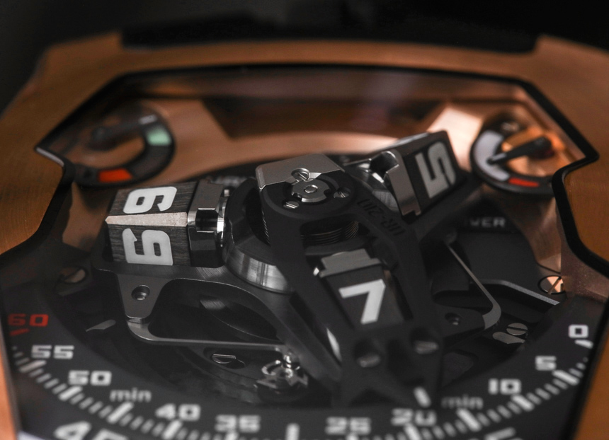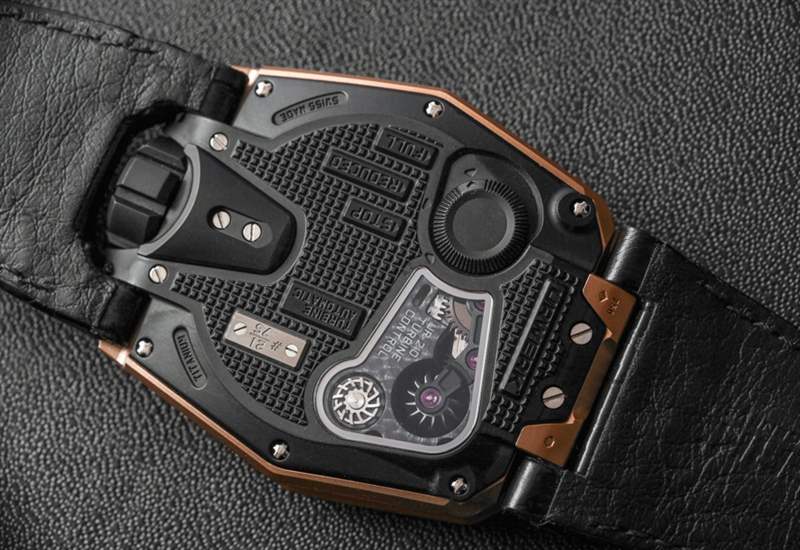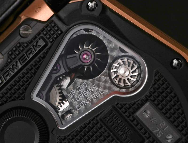 后一項功能并非 UR-210 獨有,但并非在所有 Urwerk 時計中都有。它是內部制造的 UR-7.10 機芯的“渦輪控制”系統的一部分,具有三種設置。Urwerk 將此系統稱為“上鏈效率選擇器”,其目的是讓自動轉子(不可見)由于摩擦增加而旋轉得更慢,或者完全阻止自動轉子上鏈——從而消除了手表自動上弦的能力。