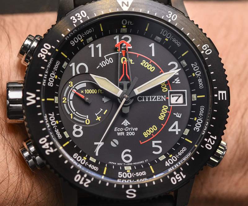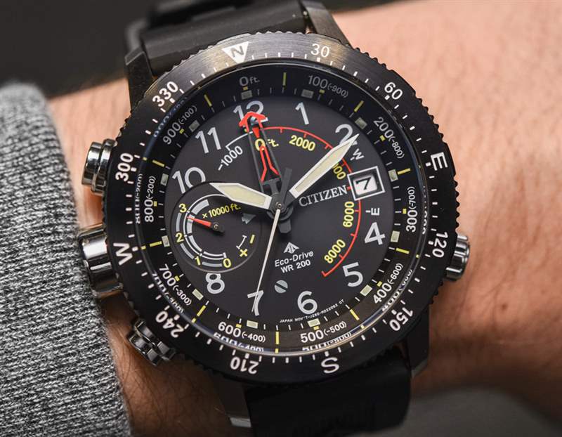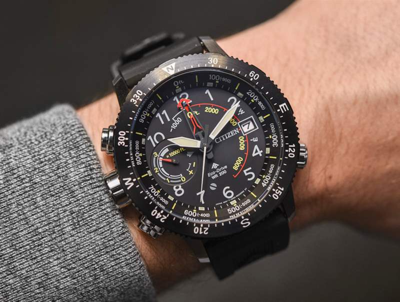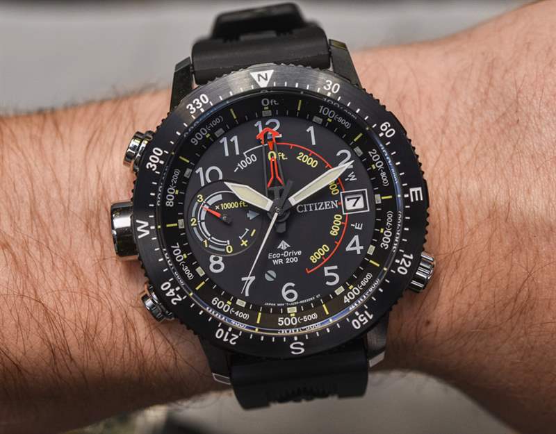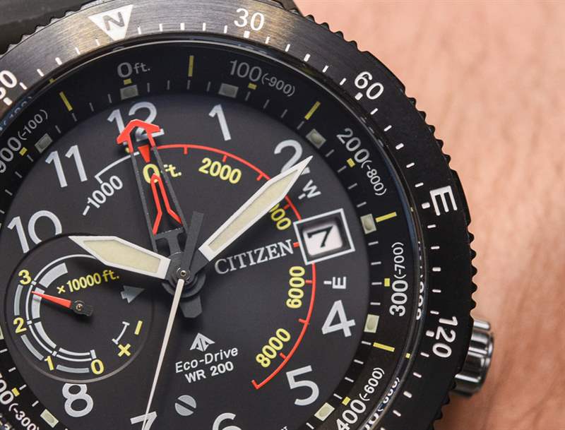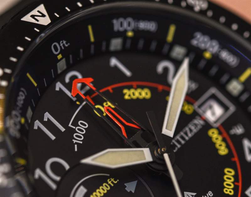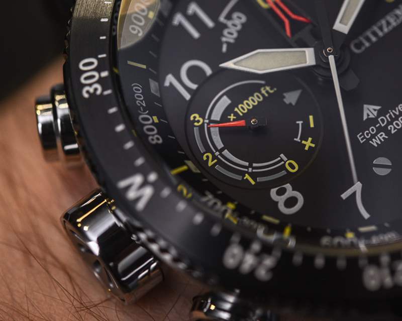 話雖如此,表盤的絕對(duì)深度并沒(méi)有讓 Altichron 感覺(jué)像其他任何東西。表盤需要這么深,因?yàn)橹行谋枰菁{五只手,再加上表盤上的第六只手,用于多功能輔助表盤。您還可以得到日期。據(jù)我了解,這款更新的 Promaster Altichron 的機(jī)芯沒(méi)有變化,它繼續(xù)包含 Citizen caliber 3290 Eco-Drive 石英機(jī)芯。除了時(shí)間、指南針、高度計(jì)(可以測(cè)量高達(dá) 32,000 英尺的非常大的部分)和日歷外,表盤還有一個(gè)用于電池壽命的動(dòng)力儲(chǔ)存指示器。