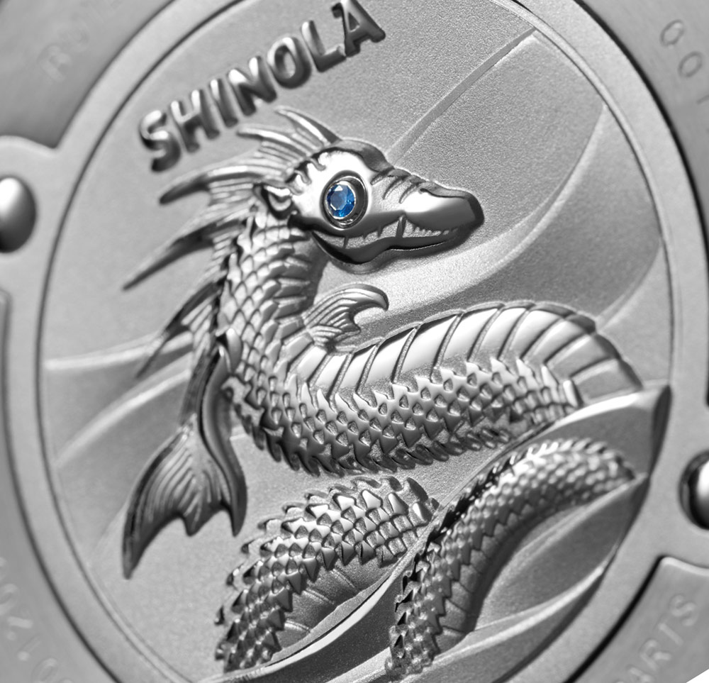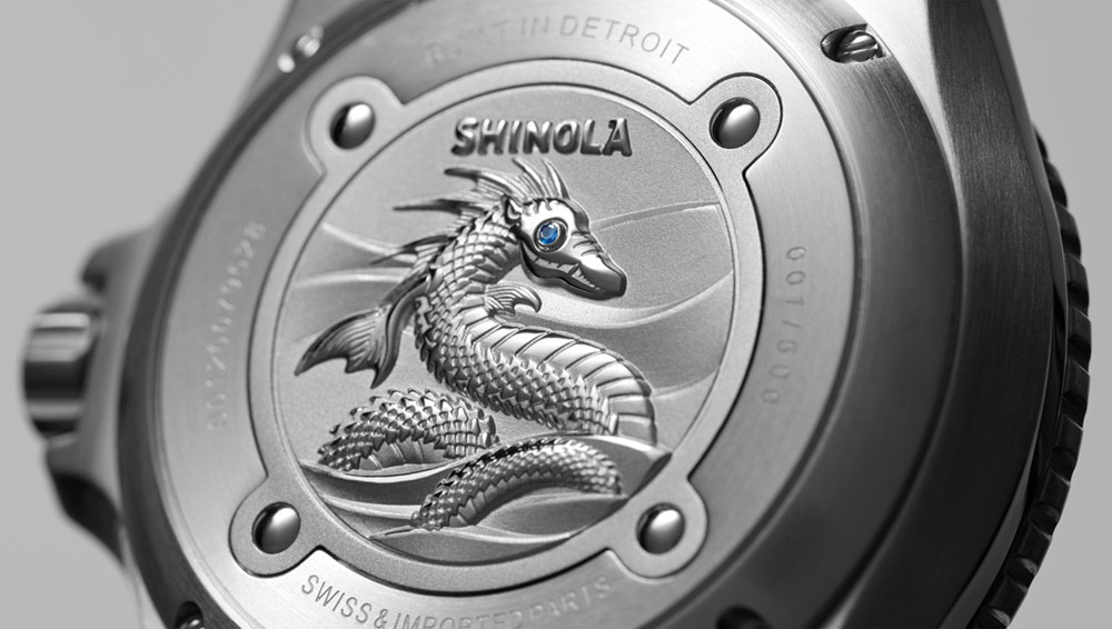 Shinola Lake Erie Monster 腕表最有趣的設計元素是底蓋,其以夢幻生物為主題,浮雕圖案的眼窩鑲嵌一顆藍色藍寶石水晶石。表殼本身是鋼制的,防水深度達 300 米,帶有可旋轉的潛水計時表圈。表殼尺寸為 43 毫米寬,表盤上方是藍寶石水晶。廣告訊息廣告信息結束