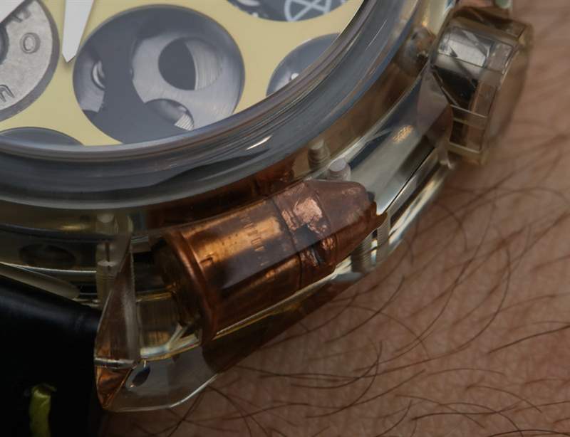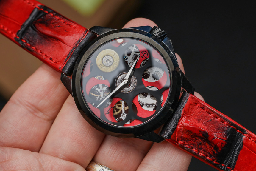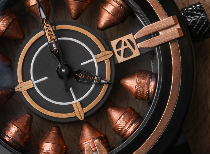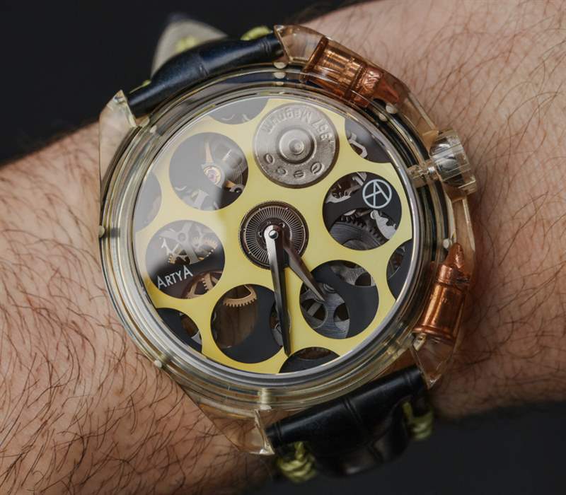 ArtyA Son of a Gun 手表可能是 Arpa 最受歡迎的系列。“槍之子”系列目前分為 10 個不同的產(chǎn)品系列——每個系列都有自己的想法,將實際子彈的零件放置在手表的表盤上。槍之子俄羅斯輪盤賭可能是最受歡迎的。一個看起來像左輪手槍的六管槍膛的旋轉(zhuǎn)圓盤有一個孔,里面裝滿了實際子彈的后部。這個圓盤可以自由旋轉(zhuǎn),當然,視覺效果類似于我想象的俄羅斯輪盤游戲中旋轉(zhuǎn)房間的樣子——盡管更安全。同樣在 44 毫米寬的表殼中,槍之子俄羅斯輪盤賭手表有多種款式,起價7,700 瑞士法郎 ,然后再上漲。一種新型號是17,900 瑞士法郎 透明樹脂盒中的版本,里面有更多的子彈。