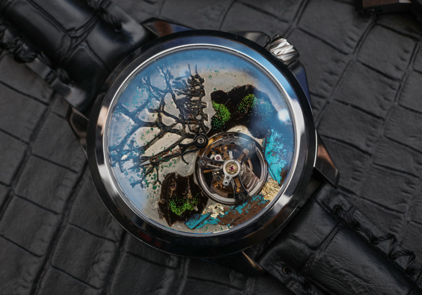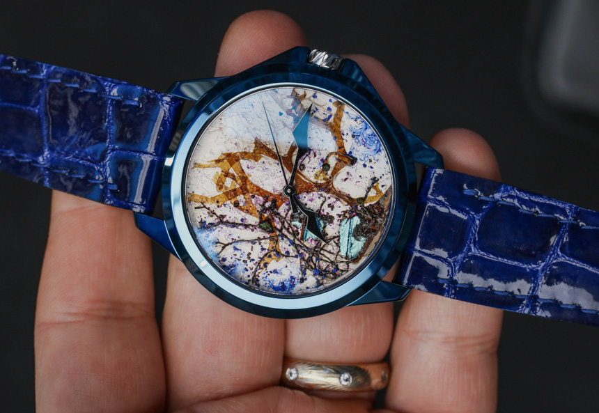 Arpa 的美學并不全是血與膽——盡管在他的許多設計中都存在對混亂的慶祝。正如品牌名稱所暗示的那樣,這些都是藝術(shù),在這個品牌看來——藝術(shù)不應該被大量生產(chǎn)。在 2017 年新的“Son of”系列(從槍之子開始)中,有海之子。這些是表盤上帶有海藻的手表——作為一系列此類概念的一部分,其中還包括帶有蝴蝶翅膀、蜘蛛、煙草和人血的表盤。海之子手表——每件都是獨一無二的,帶有藍色 PVD ??涂層的 44 毫米寬精鋼表殼售價7,900 瑞士法郎,除非您選擇137,000 瑞士法郎海之子陀飛輪模型。這些不符合我個人的口味,因為我更喜歡在我的鐘表設計中采用更對稱的結(jié)構(gòu),盡管我很欣賞這種新穎性,并且知道 ArtyA 會有它的接受者。廣告訊息廣告信息結(jié)束