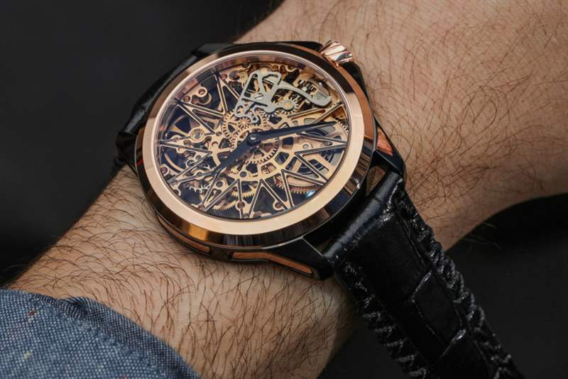 你可以花23,900 瑞士法郎 購買一個裝有大量大鉆石的鋼制表殼的 Son of Gears Shams 系列手表,但這也是 ArtyA 的入門級系列之一。The Son of Gears Shams 手表是對鏤空手動上鏈機械機芯的簡單演繹——盡管是以 ArtyA 方式完成的。我很喜歡他們。機芯鏤空靈動,色彩與款式的整體組合頗具魅力。這些實際上是 ArtyA 目前生產(chǎn)的最保守的手表之一,采用該品牌的標準 44 毫米寬鋼表殼。起價4,400 瑞士法郎, PVD 黑色最高5,400 瑞士法郎,巧克力金色6,400 瑞士法郎, 12,900 瑞士法郎采用雙色精鋼和金色表殼,7,400 瑞士法郎購買帶有手工雕刻表圈的《齒輪之子 Shams》系列腕表。