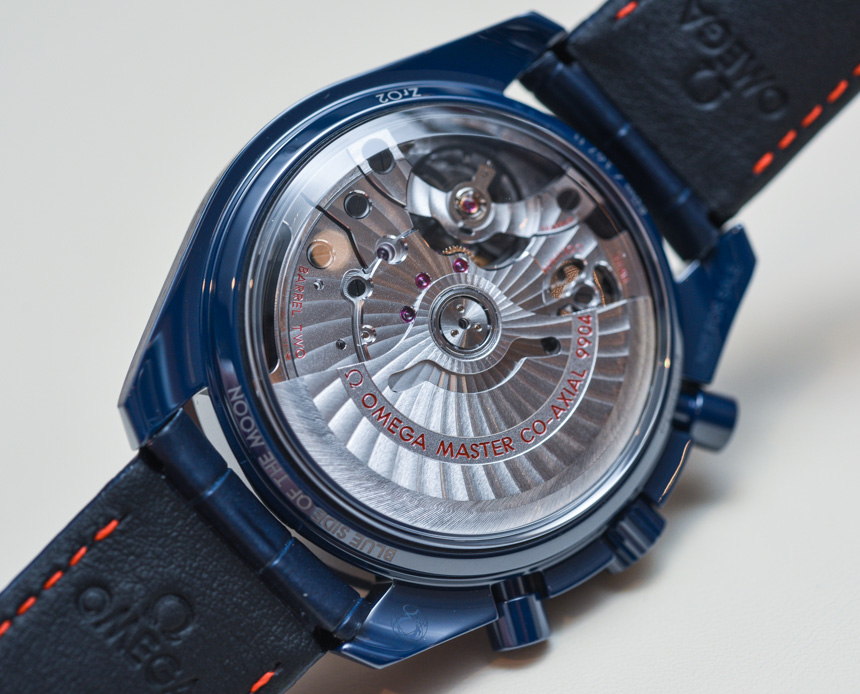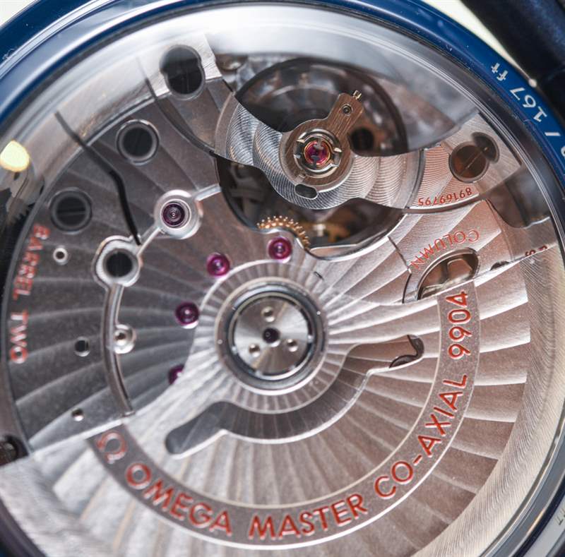 由于我們之前已經(jīng)介紹過核心的超霸同軸至臻天文臺計時月相腕表,因此我不打算詳細討論機芯或腕表的功能。回想一下,9904 型機芯在計時碼表和日期復(fù)雜功能中增加了月相指示器。機芯表盤布局的對稱性令人印象深刻,令人向往。注意每個子表盤如何有兩只手。這確實是迄今為止最有趣和最吸引人的現(xiàn)代歐米茄機芯之一。當(dāng)然,它具有同軸擒縱系統(tǒng)、METAS 認(rèn)證(以及與之相關(guān)的一切)、4Hz 工作頻率和 60 小時的動力儲備。通過底蓋的藍寶石水晶窗可以輕松欣賞到機芯。