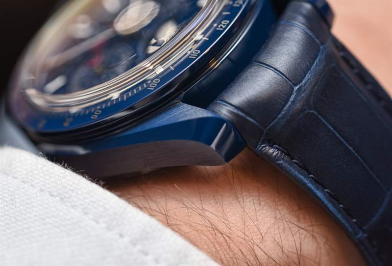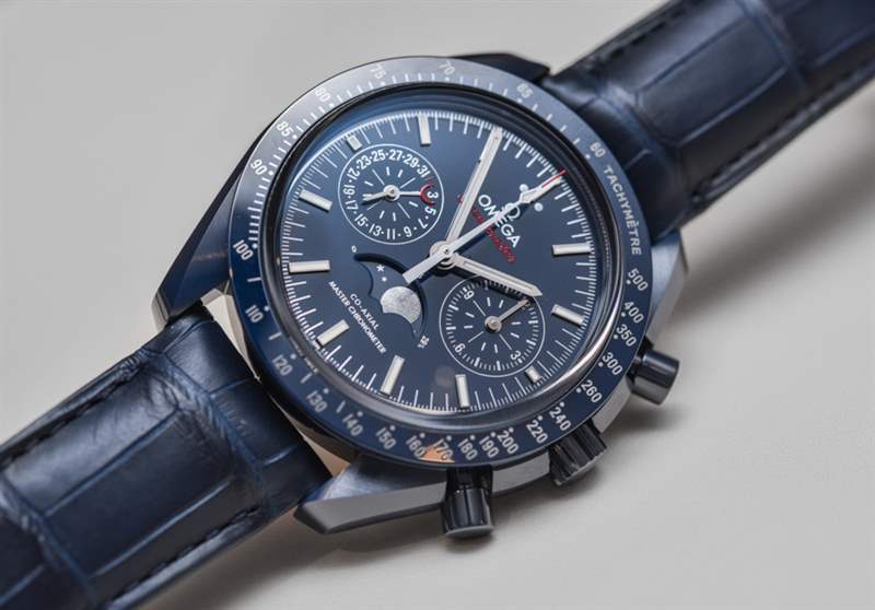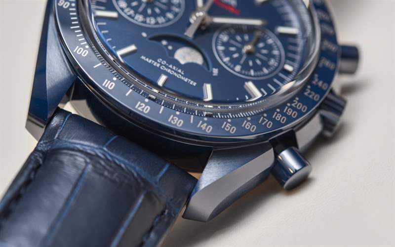 自從最初的 Speedmaster Dark Side Of The Moon(帶有性感的黑色陶瓷表殼)幾年前在 Baselworld 引起轟動以來, “月亮的(顏色)面”已經(jīng)成為歐米茄的流行語。歐米茄熱切地嘗試通過一系列不同的設(shè)計來保持彩色陶瓷表殼的趨勢。甚至 Seamaster Planet Ocean 潛水表也有黑色或藍色陶瓷表殼可供選擇。歐米茄 Speedmaster Blue Side Of The Moon 是 2017 年最新推出的陶瓷超霸腕表——實際上也是唯一一款全新的陶瓷腕表。根據(jù)典型的歐米茄慣例,手表的官方(全名)名稱是歐米茄超霸藍色月球同軸主計時計時碼表月相。