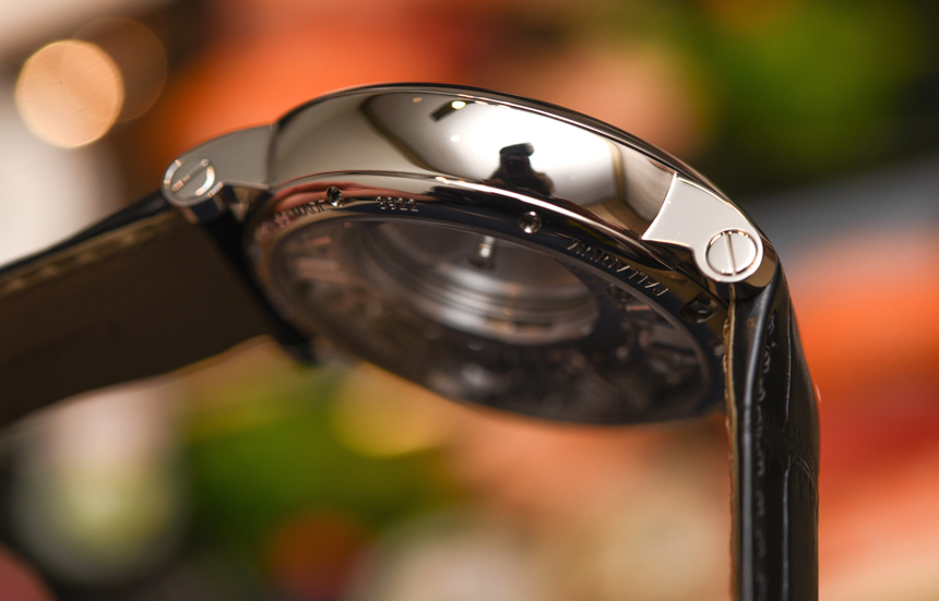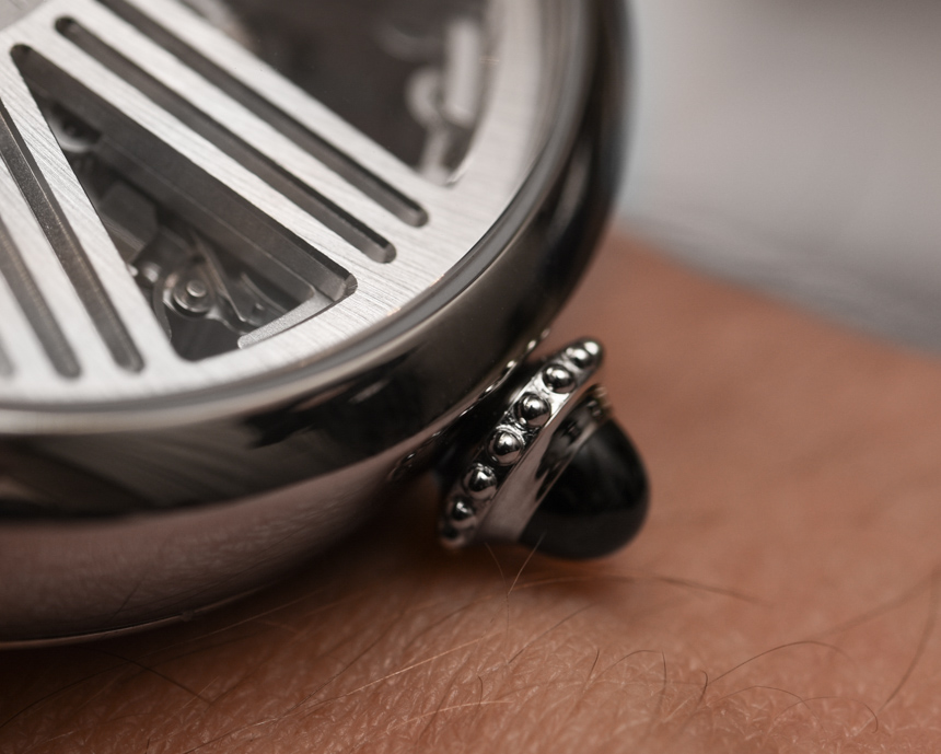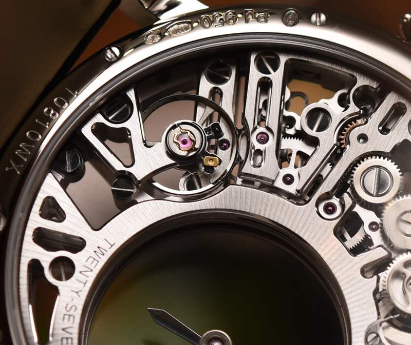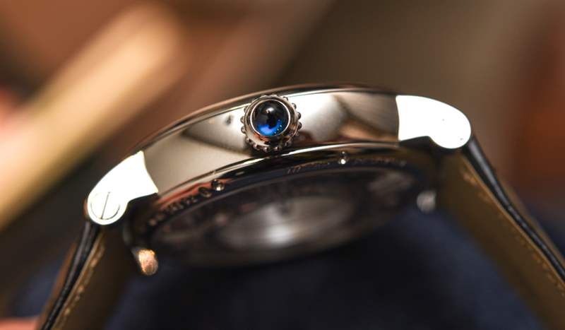 Rotonde de Cartier Mysterious Hour Skeleton 采用 42 毫米寬的鈀色(我相信現(xiàn)在是唯一的),與任何 Rotonde 型號(hào)一樣耐磨且舒適。為什么是鈀?好問(wèn)題; 卡地亞可能想知道您是否發(fā)現(xiàn)這種異國(guó)情調(diào)且實(shí)用性有問(wèn)題的稀有材料是獨(dú)一無(wú)二的。圓形表殼帶有一點(diǎn)法國(guó)風(fēng)情(盡管它是瑞士制造的),其標(biāo)志性的卡地亞風(fēng)格表冠帶有藍(lán)色藍(lán)寶石水晶凸圓形寶石(請(qǐng)注意,過(guò)去卡地亞主要使用藍(lán)色藍(lán)寶石水晶作為凸圓形寶石,只是它更高-如今的終端型號(hào)采用藍(lán)寶石,而更多主流型號(hào)則采用藍(lán)色尖晶石),以及與表耳相匹配的迷人圓形表圈。