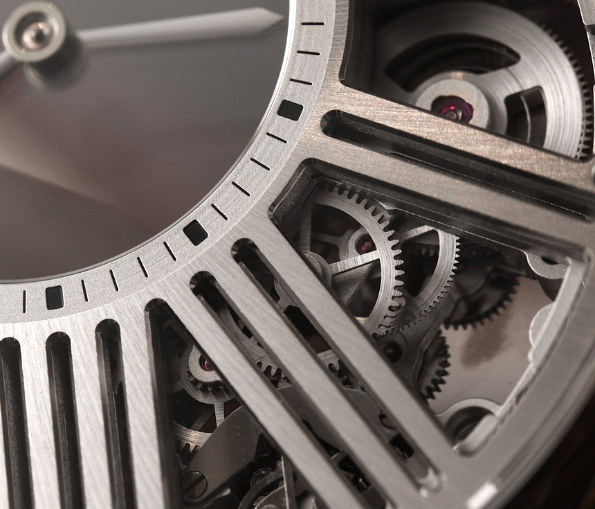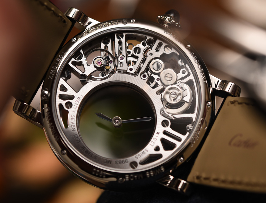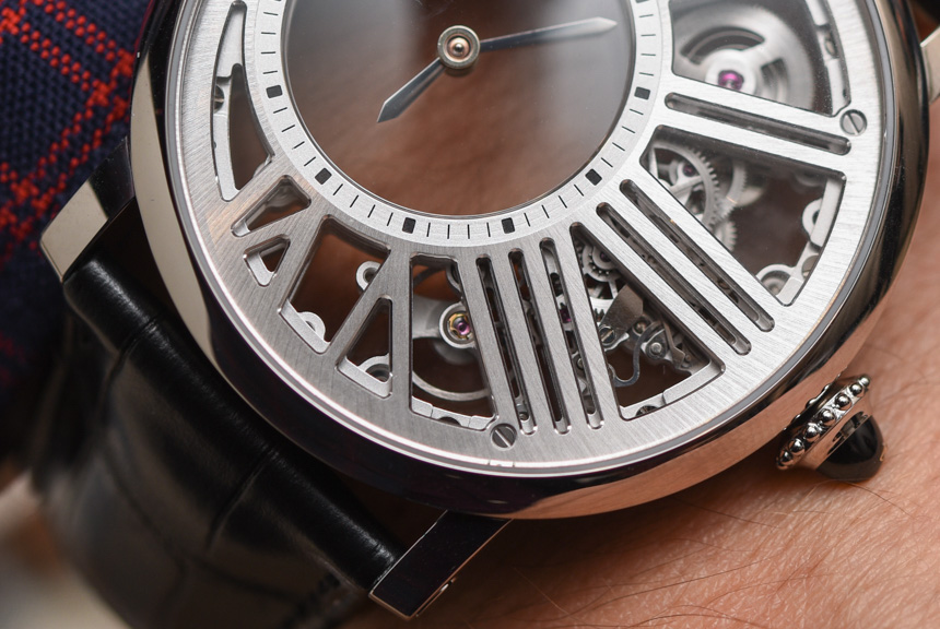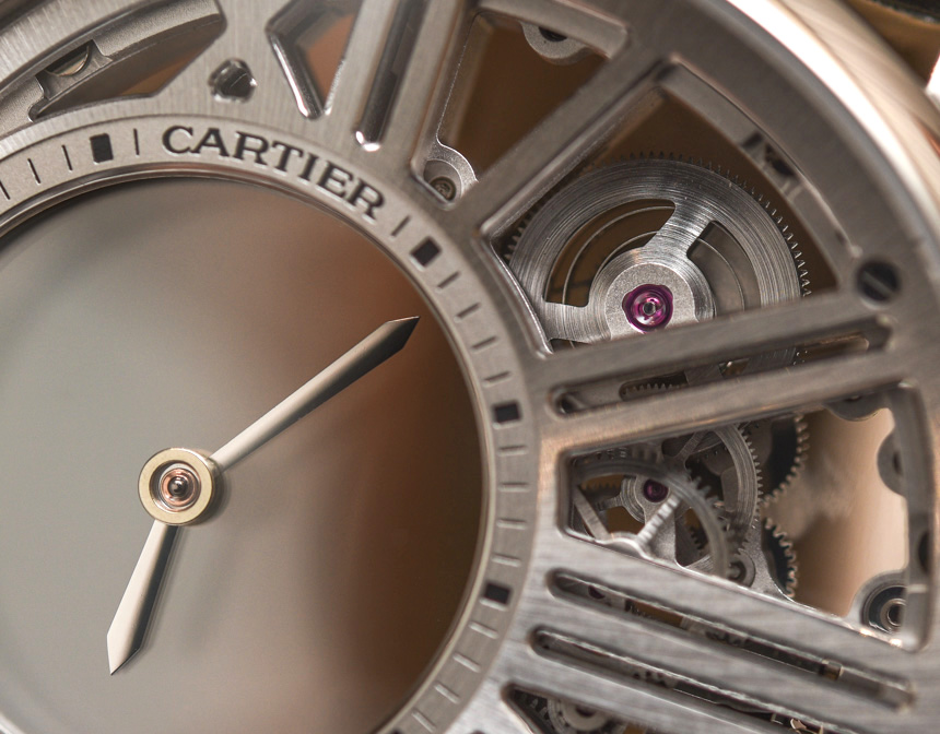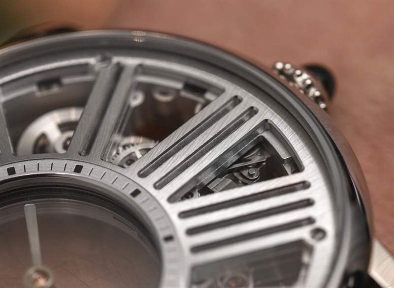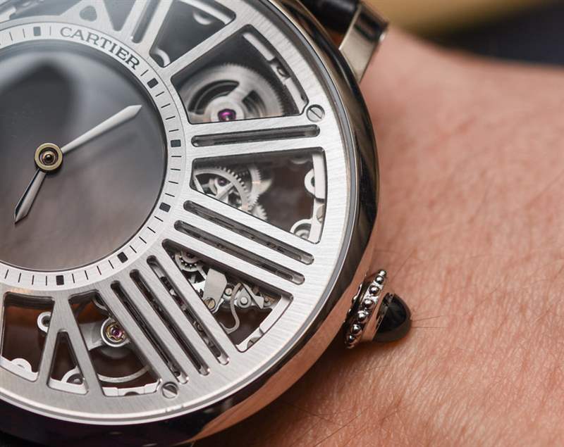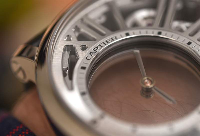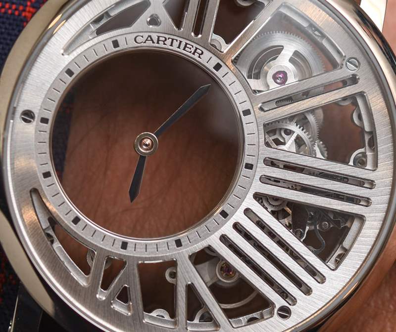 機(jī)芯采用兩塊藍(lán)寶石水晶板,指針置于其上。中間有一個(gè)傳統(tǒng)的安裝系統(tǒng),兩個(gè)藍(lán)寶石水晶圓盤(pán)的中心軸點(diǎn)連接。小時(shí)和分鐘表盤(pán)右側(cè)的齒輪移動(dòng)這些圓盤(pán),進(jìn)而移動(dòng)指針。構(gòu)成所有這一切的框架,以及機(jī)芯的一部分,是手工完成的盤(pán)子,其中包括“結(jié)構(gòu)”羅馬數(shù)字圖案。整體外觀很棒,盡管它不是人們?cè)谙胂笫止ね瓿傻臋C(jī)械表機(jī)芯時(shí)可能會(huì)考慮的常見(jiàn)裝飾風(fēng)格。在鏤空表盤(pán)和機(jī)芯方面,卡地亞選擇了更現(xiàn)代、可以說(shuō)是男性化的外觀,因?yàn)樗哂歇?dú)特的美感。