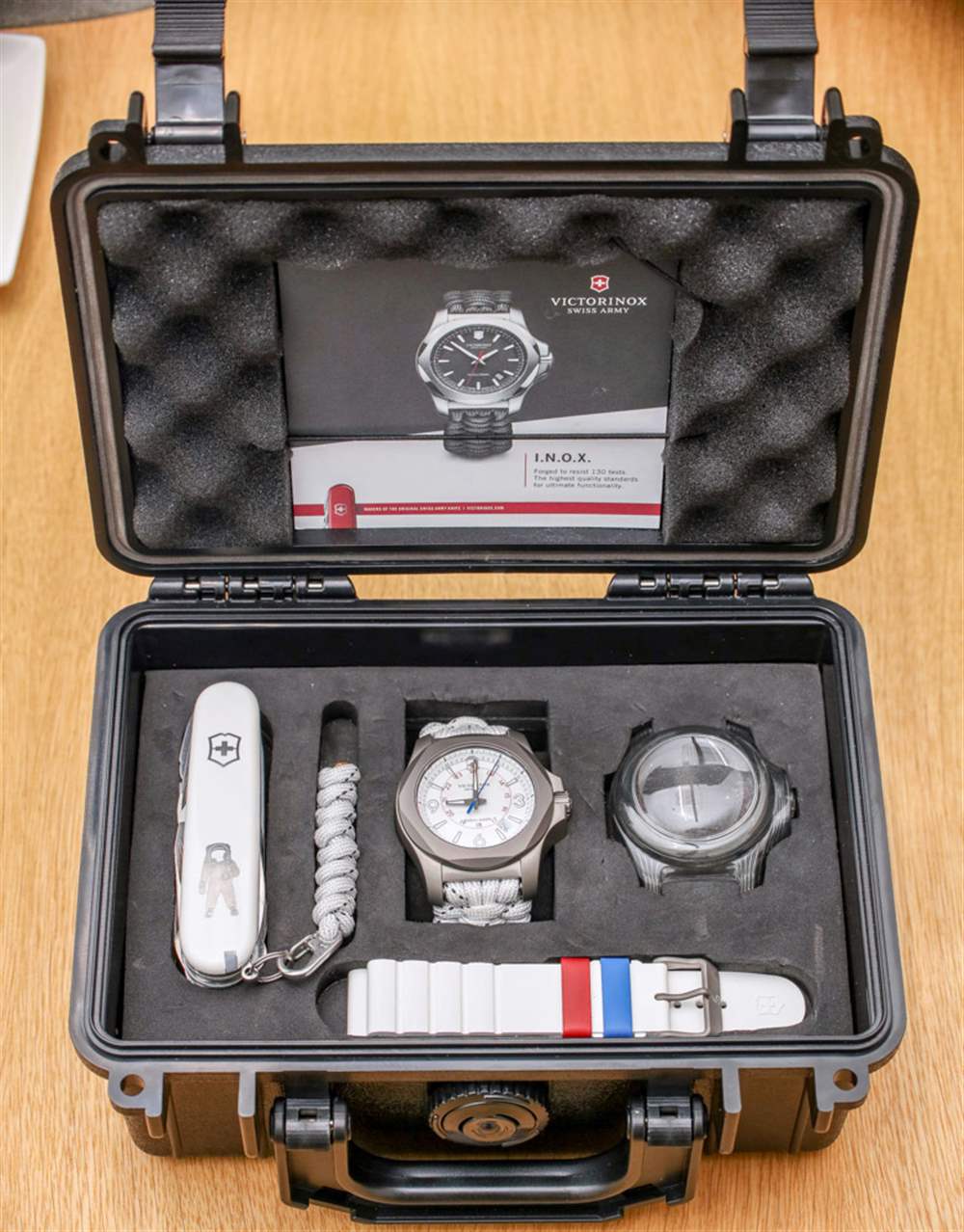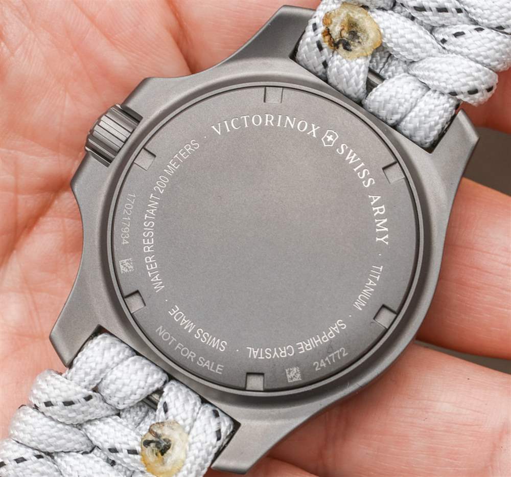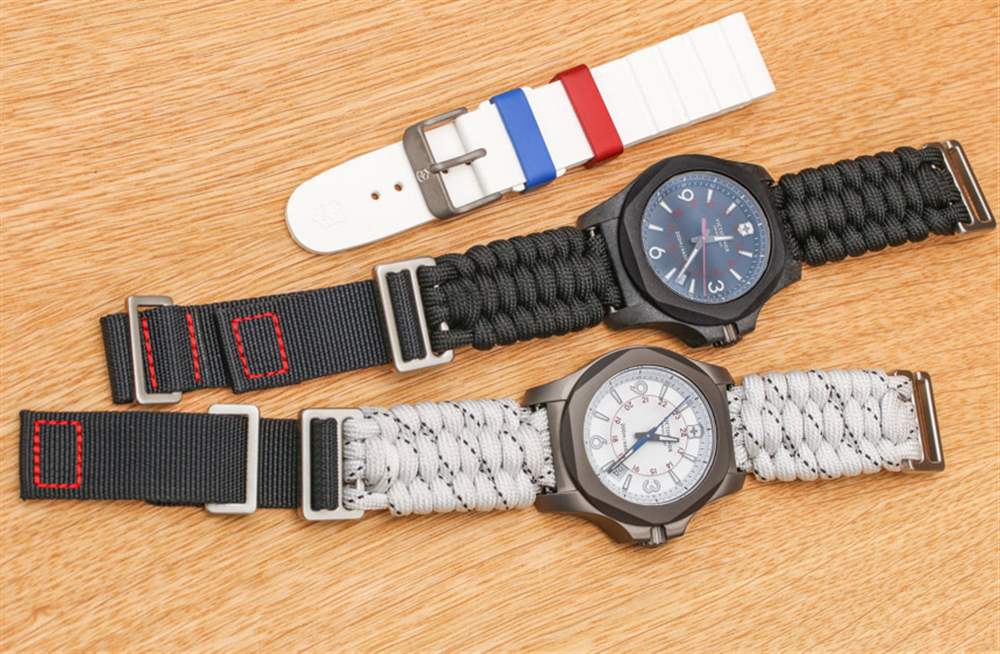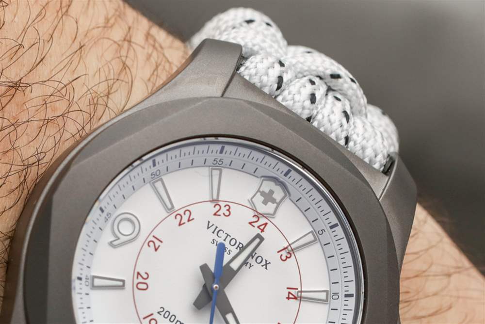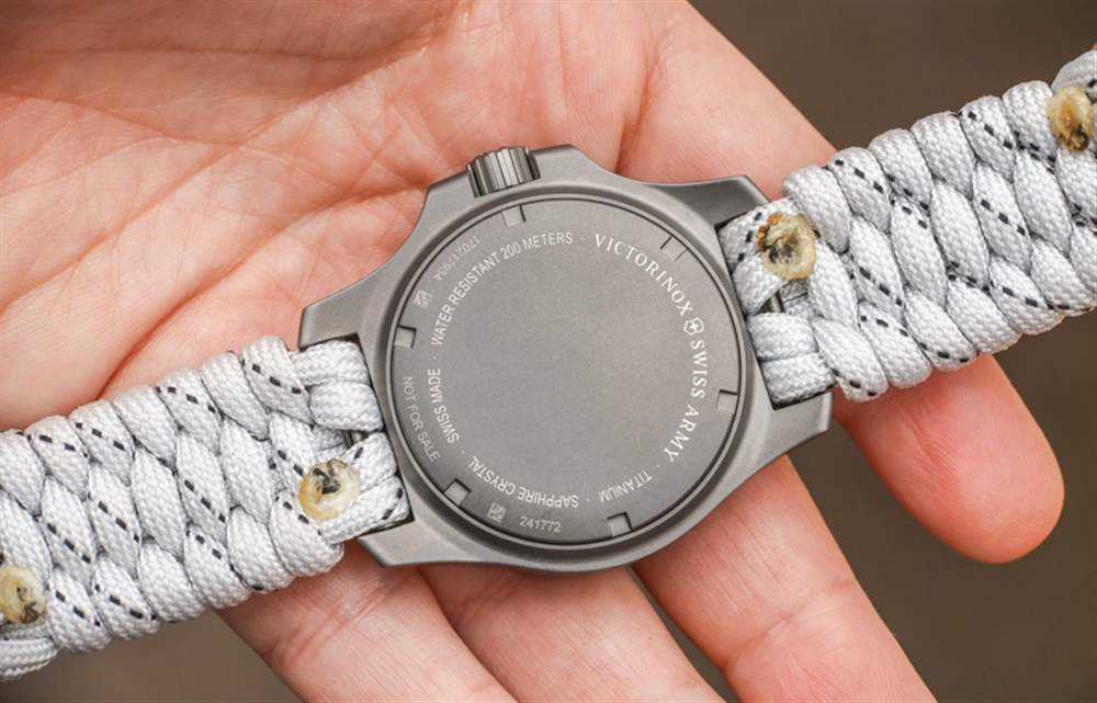 INOX Sky High 提供軍用風格的白色碳纖維表盤,單獨搭配帶斑點的白色傘繩表帶(包含對位芳綸纖維 – 顯然比鋼強 8 倍)。在盒子里,你還會得到一條白色橡膠表帶(帶有藍色和紅色表帶環,有點酷),以及一把帶有傘繩附件的限量版小型瑞士軍刀。根據 Victorinox 的說法,我對這個系列的唯一抱怨是無法真正幫助的?;旧纤c傘繩帶的底面是黑色織物而其余部分是白色的事實有關。這并不可怕,但如果搭配白色會更好。