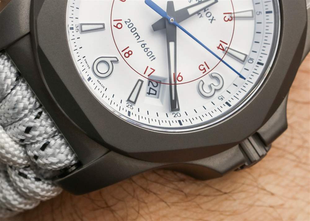 INOX Sky High 表殼與大多數其他 INOX 型號一樣寬 43 毫米(不包括新的女式 INOX V 或稍大的 INOX Professional Diver)。噴砂鈦金屬表殼防水深度達 200 米,并配有 AR 涂層藍寶石水晶鏡面。水晶上有一個紅色的 24 小時標記環,這是一個有爭議的設計元素,但在我看來很酷。手表內部是瑞士朗達 715 型石英機芯。