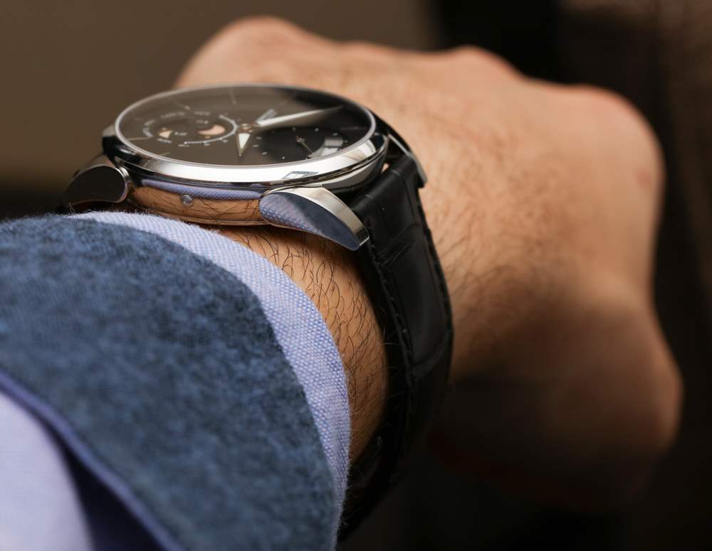 戴在手腕上的 Tonda 1950 Lune 搭配黑色鱷魚皮 Hermès 表帶,既舒適又迷人。作為正裝手表,它在眼睛上是舒緩的,但也有點不同,這很好。它也有一些陽剛之氣,我覺得這很重要,因為 Tonda 1950 既是男款又是女款——在我看來,Lune 更適合男性。
