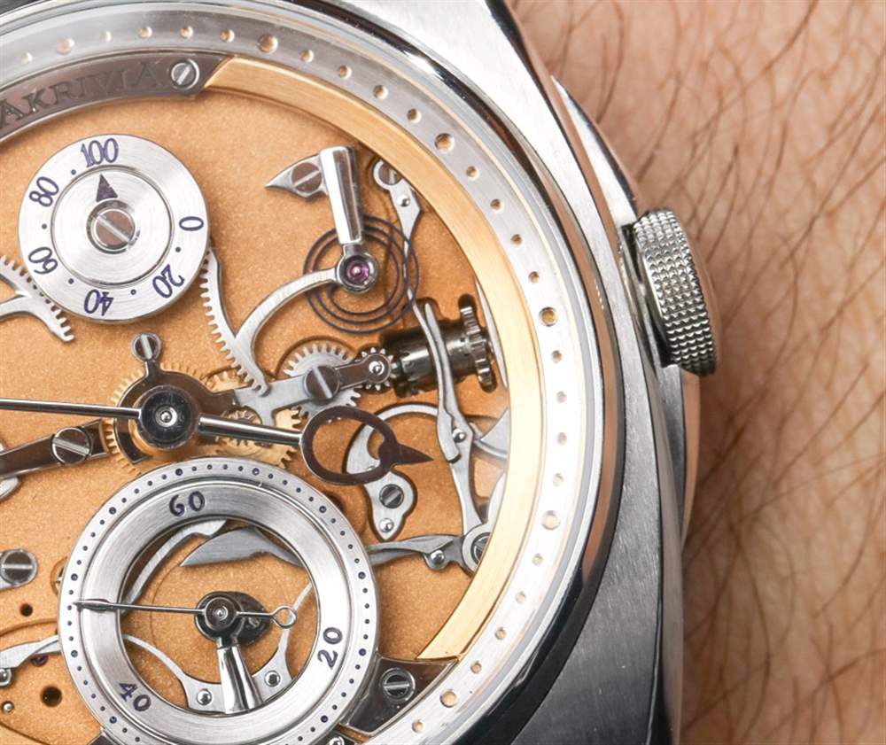 仔細觀察鏤空表盤上的秒針,您會看到心形凸輪,它是歸零功能的一部分。對于那些喜歡機械表的人來說,AkriviA AK-06 確實為本質上非常傳統的產品提供了視覺上令人愉悅和現代的視角。我最喜歡這些類型的動作是它們從頭開始設計,既有吸引力又實用。盡可能地裝飾工業手表機芯是一回事,但佩戴一個設計時沒有考慮大規模生產的機芯是完全不同的事情,它專門頌揚制表藝術。