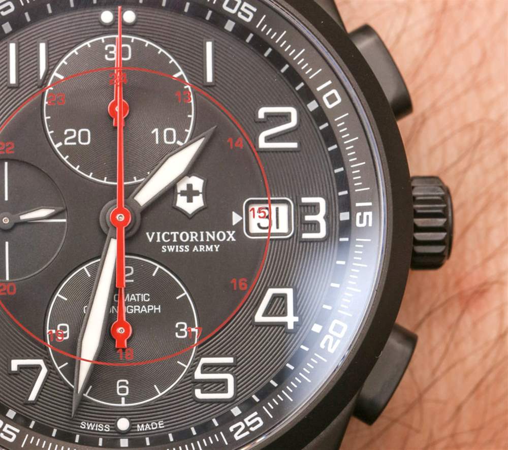 表殼背面是一個展示窗,可以看到機芯。表盤上方是平坦的 AR 涂層藍寶石水晶。Airboss Black Edition 系列設計的一個有趣特點是在藍寶石水晶底面放置了一個紅色軍用時間刻度。表盤上有標準時間和軍用時間是許多 Victorinox 瑞士軍表的標志,因此這只是一種創造性嘗試。我知道在圖像中很多人擔心這個元素會分散注意力,但我認為這是一個受歡迎的設計元素。