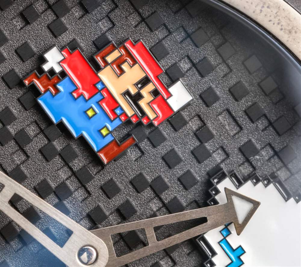 Romain Jerome 或多或少地為他們的每款電子游戲主題手表復制了相同的公式。這意味著使用大部分啞光(表耳“腳”經過拋光)黑色 PVD ??涂層鈦金屬表殼,表盤采用特殊的 3D 成型工藝制成,非常適合復制像素的外觀。表盤上方是時針和分針。