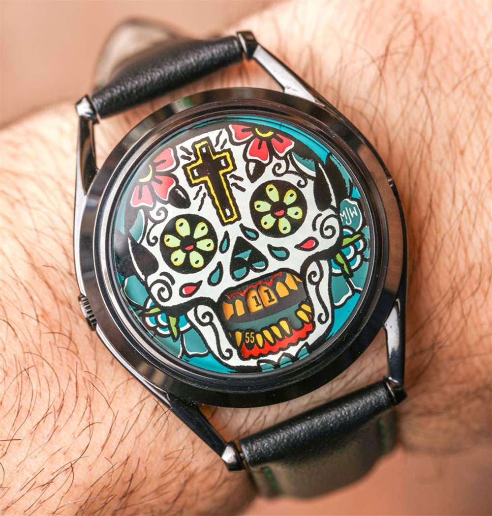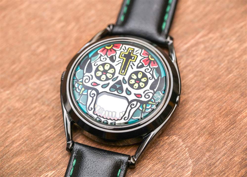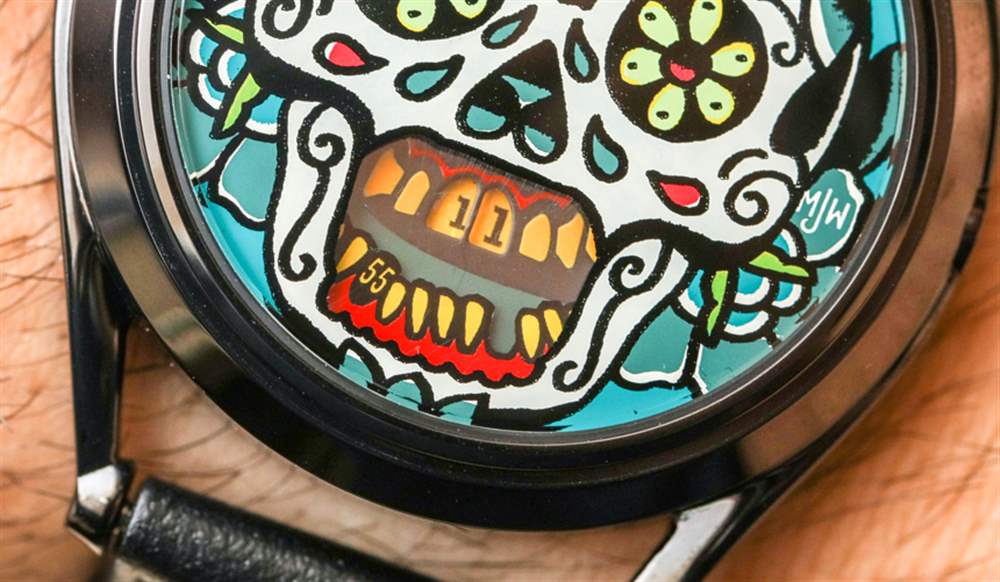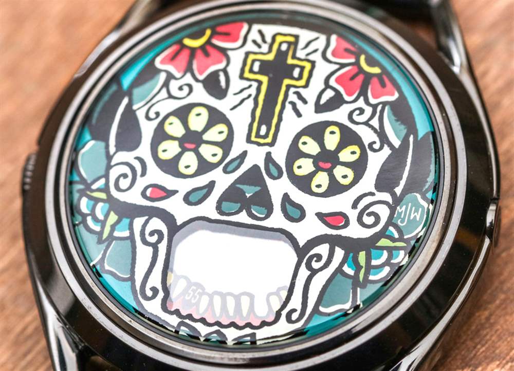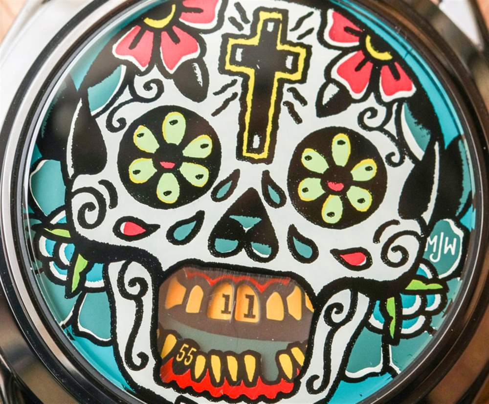 MJW 在 The Accurate 之后推出了更多圖形——但同樣構(gòu)思——Mr. Jones Last Laugh 手表系列,該系列已經(jīng)發(fā)展成幾個不同的版本。在這篇評論中,您可以看到 Last Laugh Tattoo,它采用表盤概念上的骷髏頭,并以色彩繽紛的墨西哥亡靈節(jié)為主題。兩個旋轉(zhuǎn)以指示時間的圓盤顯示為頭骨的牙齒。同樣,它并不是要成為易讀性的縮影,而是作為一種藝術表達,盡管如此,它仍能告訴時間。對一些人來說,死亡的提醒是一種威脅,顯然,對另一些人來說,這是一個賦予他們力量的概念,提醒他們我們每個人都面臨著同樣的命運,所以生活就是你做什么,而你有能力做某事。