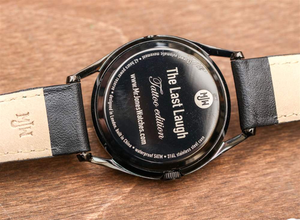 表殼為鋼制,防水深度為 50m,并帶有礦物水晶。Mr. Jones Last Laugh Tattoo 的表殼為黑色 PVD ??涂層,而其他表殼則為天然精鋼。質(zhì)量是完全可以接受的價格。MJW Last Laugh Tattoo 的表盤藝術品是由英國紋身藝術家 Adrian Willard 特別委托制作的。雖然大多數(shù) MJW 手表是石英的,但該型號配備了中國制造的 ST1721 自動機械機芯,可驅(qū)動指示小時和分鐘的圓盤“牙齒”。