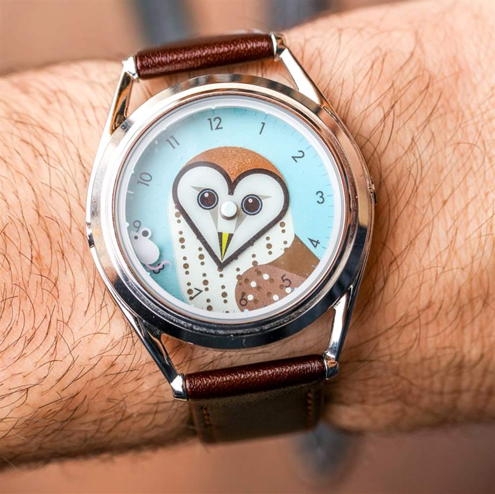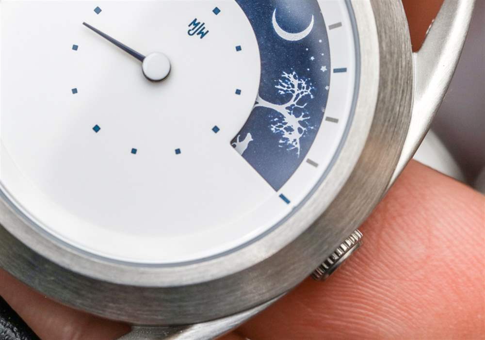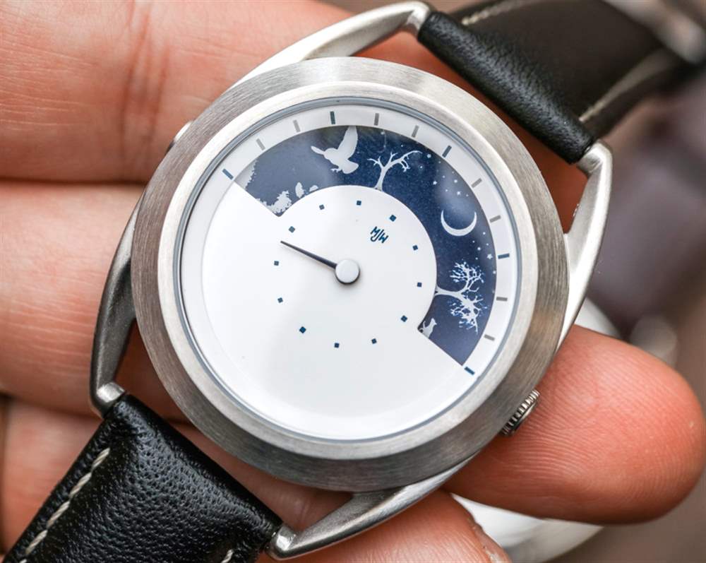 讓我們以較輕的語氣,將注意力轉(zhuǎn)移到Mr. Jones Sun and Moon 腕表,它是一種看時光流逝的藝術表現(xiàn)。很少有 MJW 手表以傳統(tǒng)方式簡單地指示時間。在這款腕表中,通過表盤頂部的新月形窗口可以看到代表白天和黑夜(以及各種植物和動物)的藝術圓盤。下面是一個傳統(tǒng)的表盤,用于指示分鐘。根據(jù)是一天中的上午還是下午,太陽或月亮代表小時的指示器。