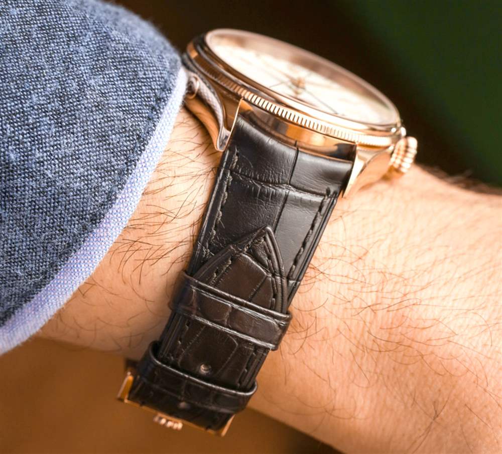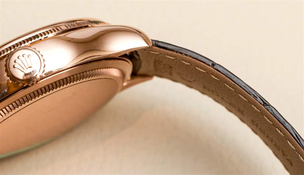 比只有時間的勞力士切利尼略厚——勞力士切利尼月相表殼也是 39 毫米寬,并有 18k 永恒玫瑰金可供選擇。經典表殼的厚度與適中的表殼直徑相結合,使這款腕表給人以愉悅、厚實的感覺,讓這款腕表顯得格外考究。附在表殼上的是一條相配的棕色鱷魚皮表帶。如果您想將手表與深色衣櫥搭配,我認為搭配黑色表帶也會很好看。