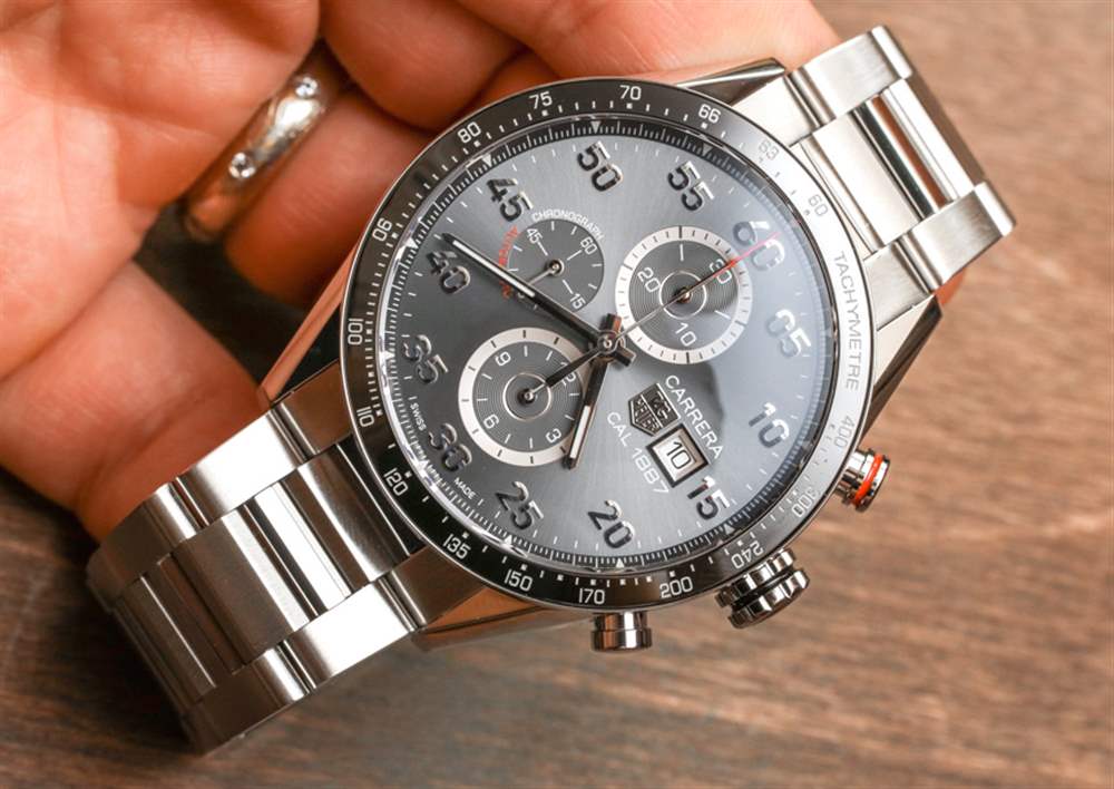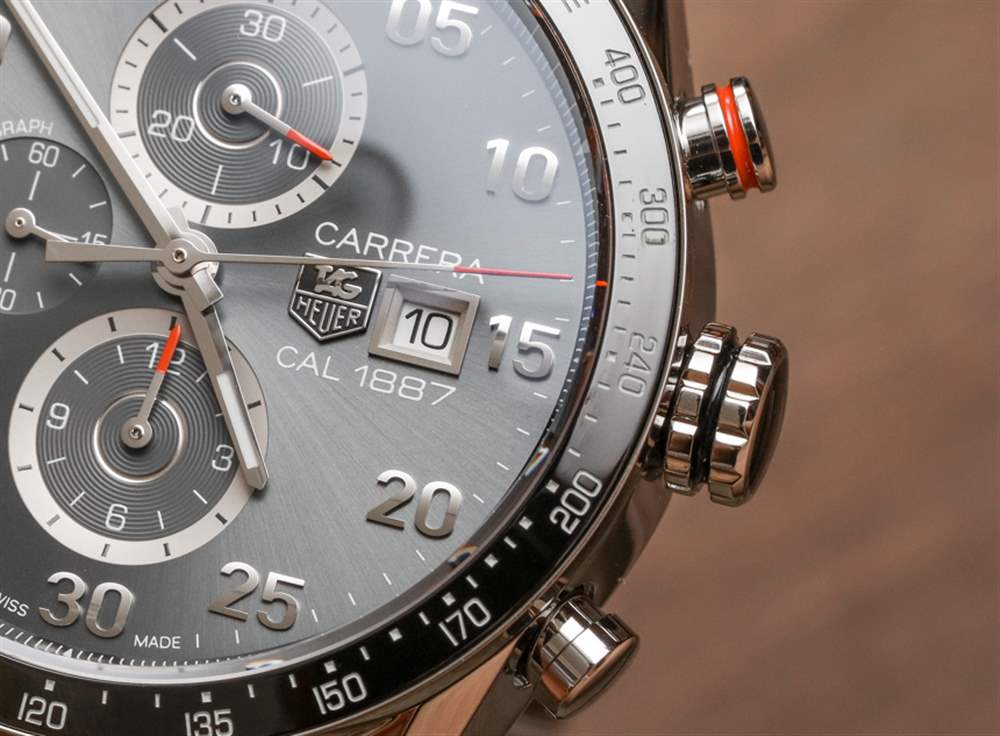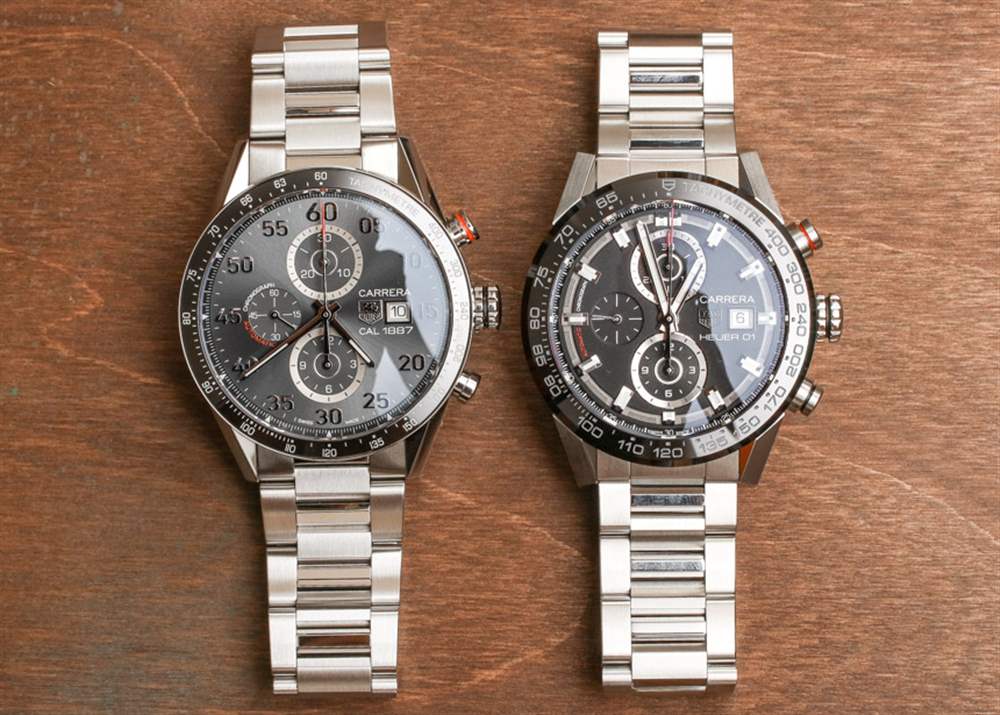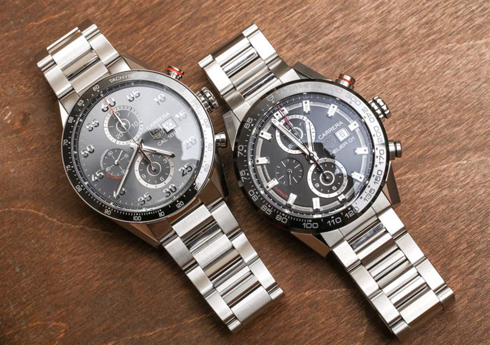 這兩款腕表分別是 TAG Heuer Carrera Calibre 1887 Automatic Chronograph 43mm reference CAR2A11.BA0799 和 TAG Heuer Carrera Calibre Heuer 01 Automatic Chronograph 43mm reference CAR201Z.BA0714。前一種型號是灰色表盤的,但泰格豪雅也生產(chǎn)幾乎相同的 Carrera 1887,全黑表盤(以及其他型號),型號為 CAR2A10.BA0799。