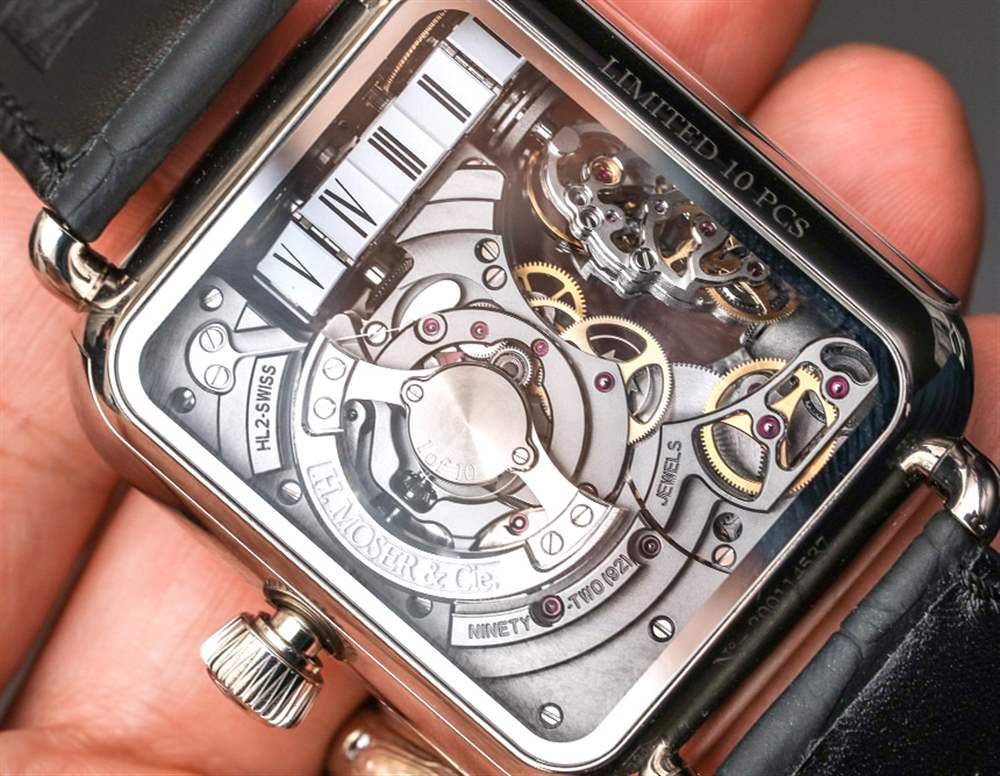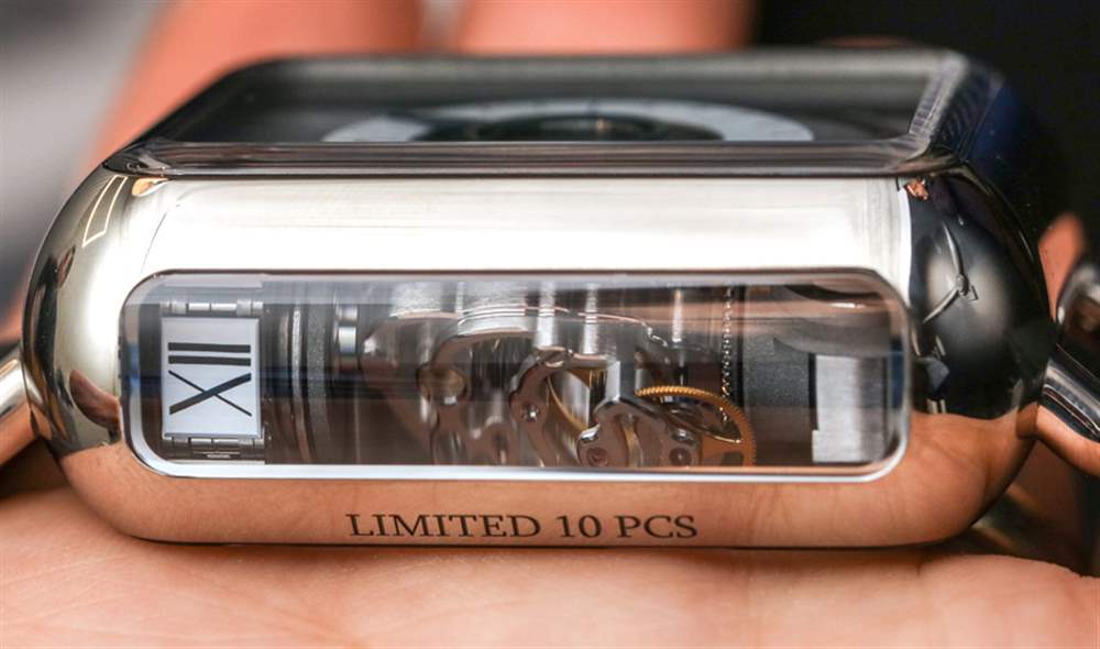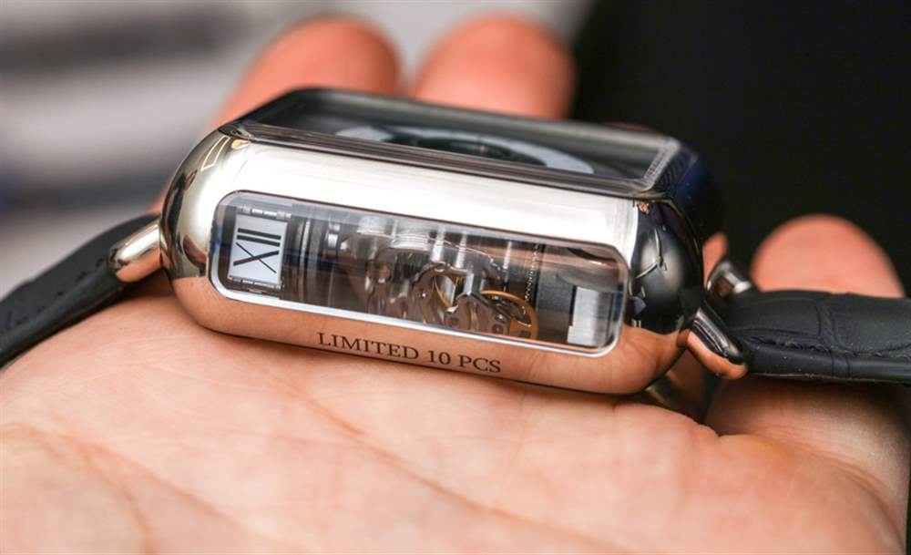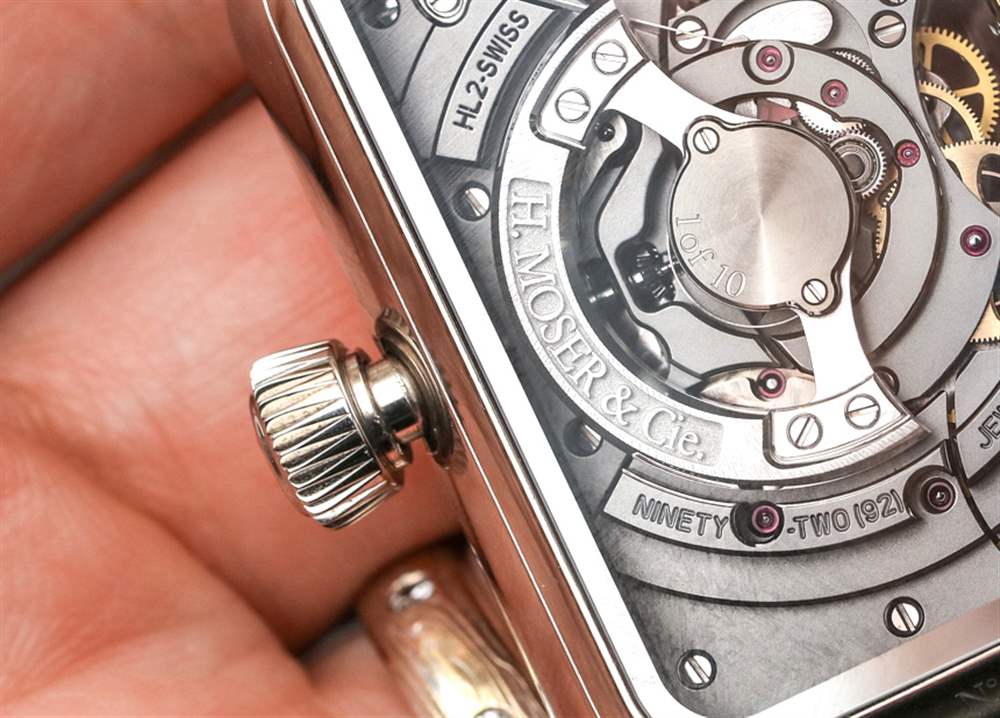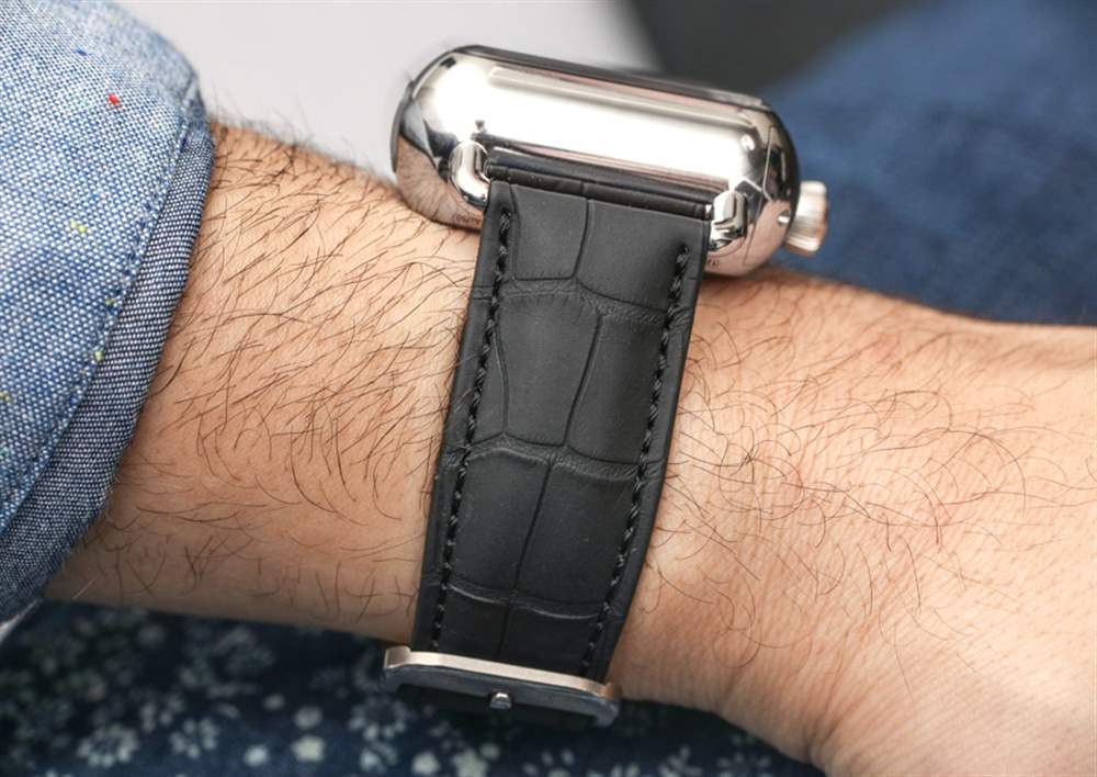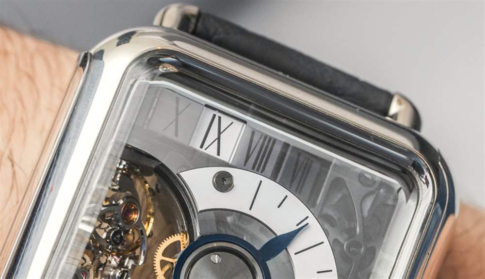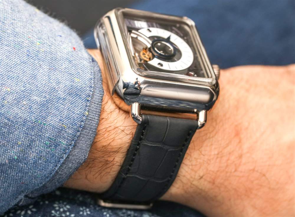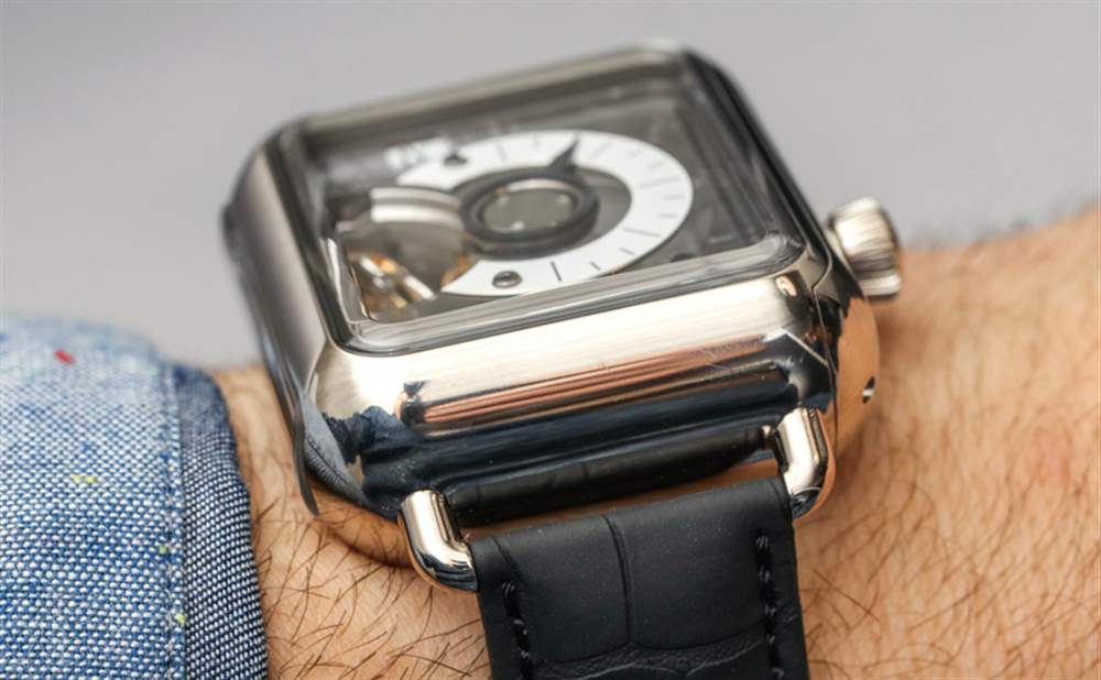所以,雖然我個(gè)人不是 H. Moser & Cie 的 Apple Watch 復(fù)制品的粉絲,但我確實(shí)喜歡這種表殼概念如何很好地容納 HL2.0 機(jī)芯。表殼的柔軟邊緣有助于減少其視覺(jué)質(zhì)量,側(cè)面藍(lán)寶石水晶窗口可以很好地觀察機(jī)芯。任何熟悉 Apple Watch 比例的人都會(huì)認(rèn)出類(lèi)似的設(shè)計(jì)線索、表耳和整體形狀,但這里有足夠的不同之處,這是對(duì) H. Moser & Cie 正在尋找的 Apple Watch 更“合適”的答案為了。易讀性也不是那么糟糕,而你在營(yíng)銷(xiāo)圖片中看不到的,當(dāng)你看到手表的人時(shí),你可以看到機(jī)芯上方的煙熏藍(lán)寶石水晶元素如何為機(jī)芯上的機(jī)制提供一個(gè)很好的視角里面,