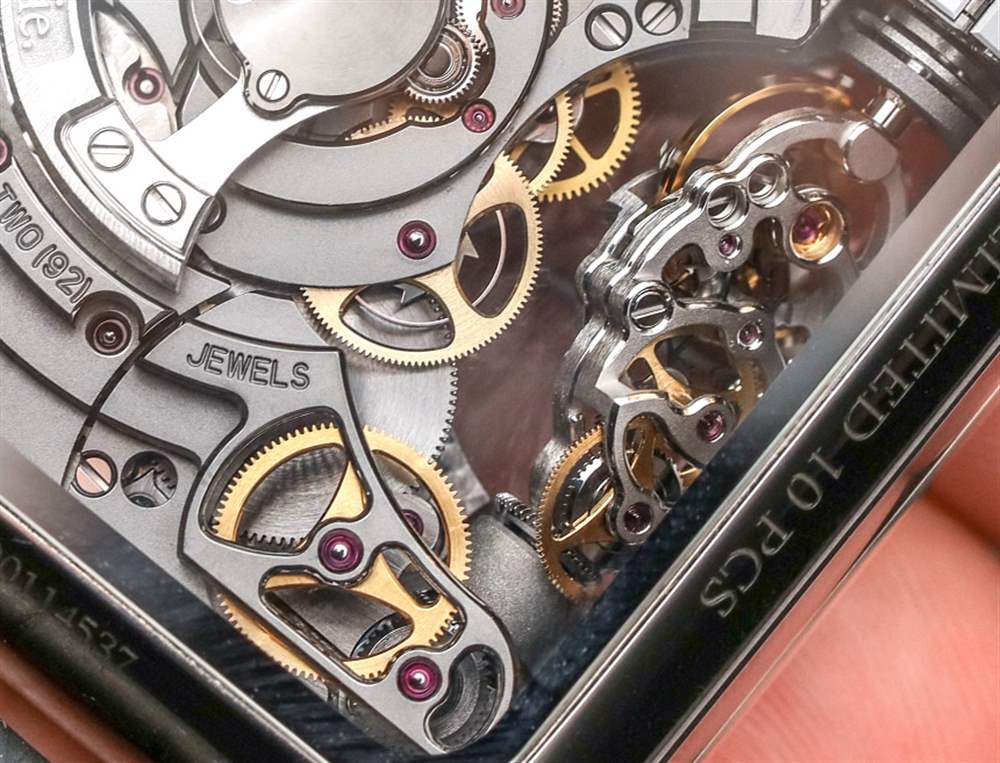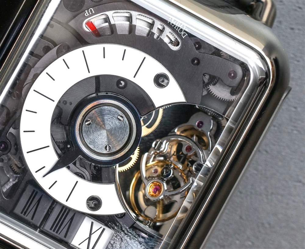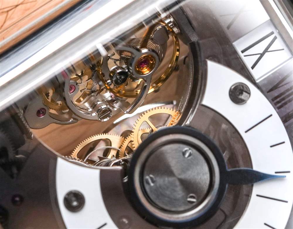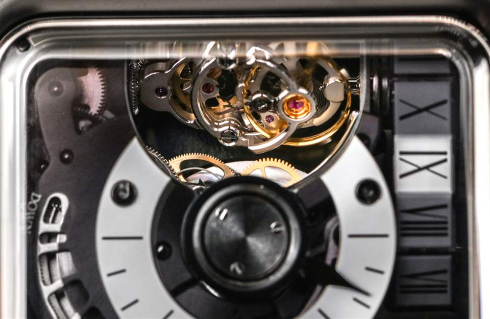 口徑 HL2.0 機(jī)芯有許多有趣的話(huà)題,從它自己的“陀飛輪”風(fēng)格開(kāi)始。擺輪調(diào)節(jié)系統(tǒng)是一個(gè)長(zhǎng)的垂直組件,隨著用于指示跳躍時(shí)間的胎面的運(yùn)動(dòng)而轉(zhuǎn)動(dòng)。您需要親自查看才能真正理解它,但在表殼頂部附近有一個(gè)小窗口,用于顯示小時(shí)(此處為羅馬數(shù)字),在每個(gè)小時(shí)結(jié)束時(shí)以一小時(shí)為單位移動(dòng)。隨著每一小時(shí)的流逝,建立調(diào)節(jié)系統(tǒng)的柱子會(huì)旋轉(zhuǎn)一點(diǎn),看到實(shí)際情況真的很有趣。擒縱系統(tǒng)的工作頻率為 18,000 次/小時(shí)(3 赫茲),機(jī)芯配備兩個(gè)主發(fā)條盒,動(dòng)力儲(chǔ)存為 45 小時(shí)。