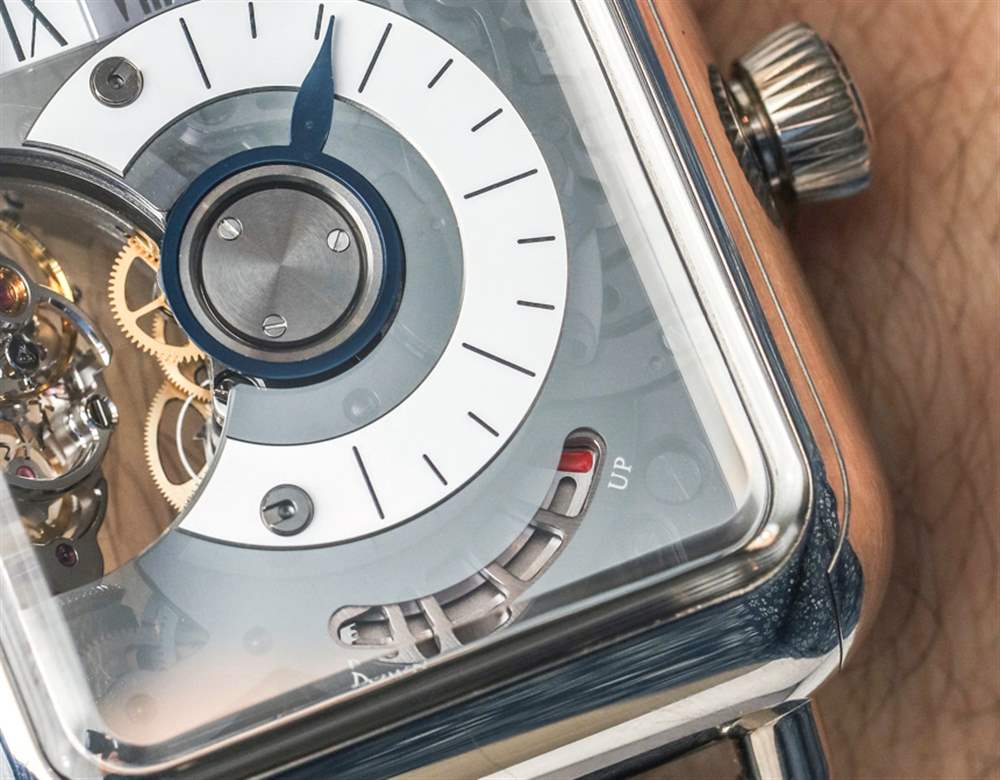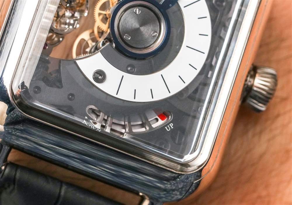 該機(jī)芯是帶有微型轉(zhuǎn)子的自動(dòng)機(jī)芯,其中一個(gè)發(fā)條盒專(zhuān)門(mén)用于為時(shí)標(biāo)鏈帶的復(fù)雜運(yùn)動(dòng)提供動(dòng)力。機(jī)芯運(yùn)作的真正美妙之處在于,每經(jīng)過(guò)一小時(shí),時(shí)標(biāo)帶會(huì)緩慢移動(dòng)幾秒鐘。這是一件很酷的事情。HL2.0 機(jī)芯還有一個(gè)分鐘逆跳指示器,在 H. Moser & Cie Swiss Alp Watch Minute Retrograde 時(shí)計(jì)上,該指針與白色大明火琺瑯表盤(pán)(采用傳統(tǒng)設(shè)計(jì)的藍(lán)鋼指針)相對(duì)。機(jī)芯底部是一個(gè)方便的動(dòng)力儲(chǔ)存指示表盤(pán)——我一直很欣賞。