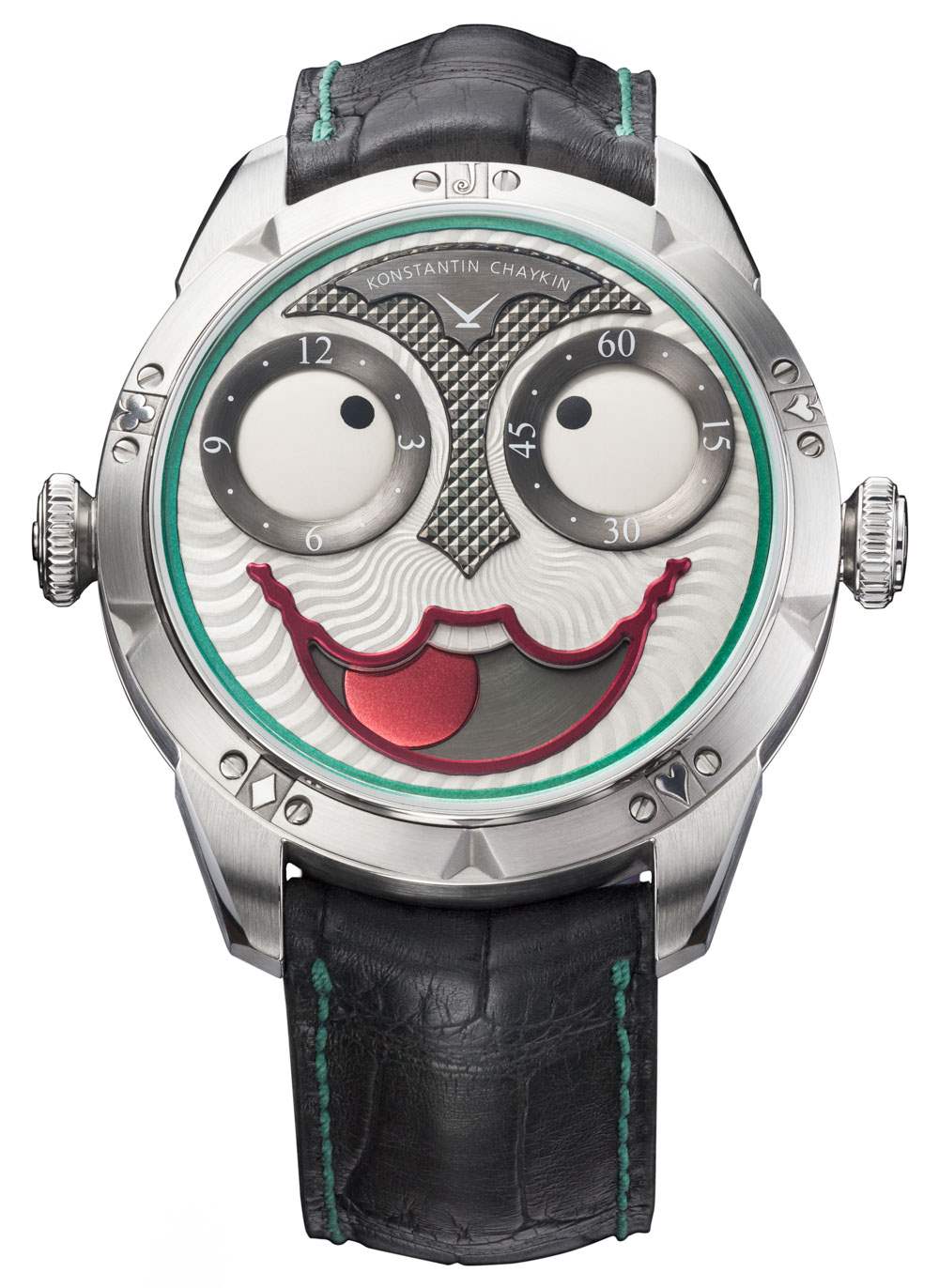 Konstantin Chaykin Joker 表殼的每一側都有一個表冠(實際上,左側只是一個用于調節月相的嵌入式推桿),用于充當這張臉的耳朵。表殼為鋼制,寬 42 毫米,厚 13.7 毫米。設計經典,但充滿活力,略帶運動感。表盤上方是藍寶石水晶,定制表帶是鱷魚皮,綠色縫線和深紫色小牛皮襯里。廣告訊息廣告信息結束
