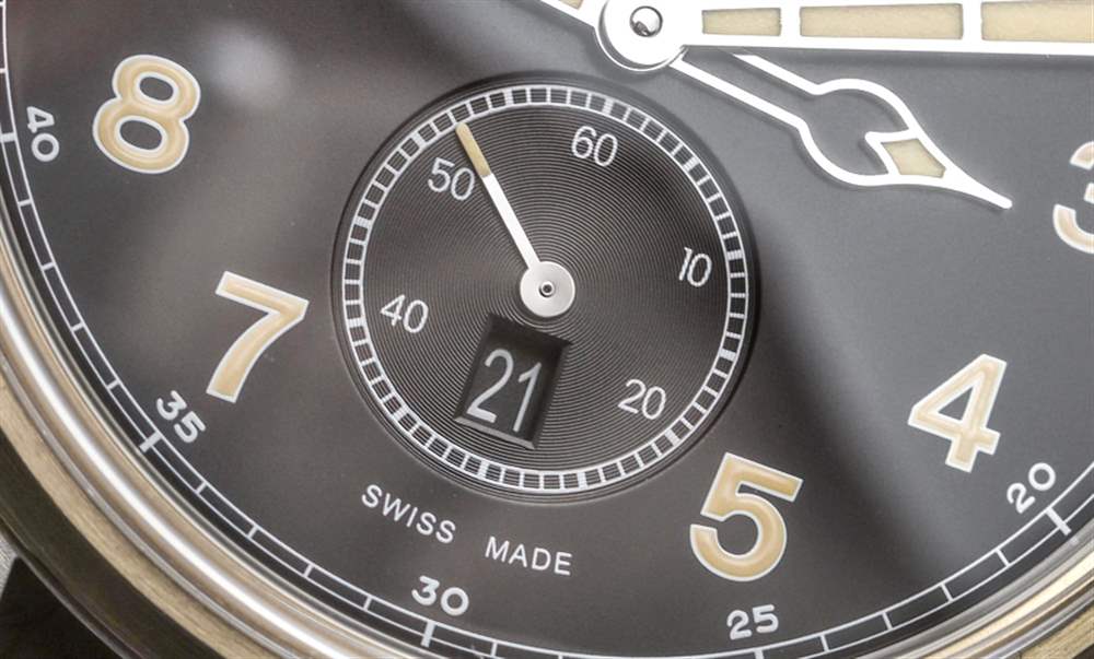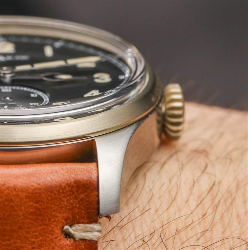 從側面看,您可以欣賞到“盒子式”圓頂藍寶石水晶,它增加了受歡迎的深度,但表面相對平坦,可以減少眩光。這也為手表增添了復古氣息,但也有助于提高易讀性。
