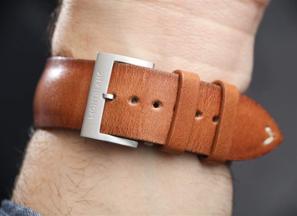 戴在手腕上的萬寶龍 1858 自動雙時腕表的尺寸為 44 毫米寬和 12.3 毫米厚(防水深度僅為 30 米)。主表殼為拉絲鋼,而表圈和表冠為青銅——這種材料會隨著時間的推移而產生古銅色。青銅在過去幾年一直是一種時尚材料,它與指針和時標上的發光體的陳舊外觀相匹配,它在這樣的手表中的整合非常巧妙。萬寶龍將這款腕表與舒適的“適合時代”、“陳年小牛皮”表帶搭配,采用迷人的干邑色。