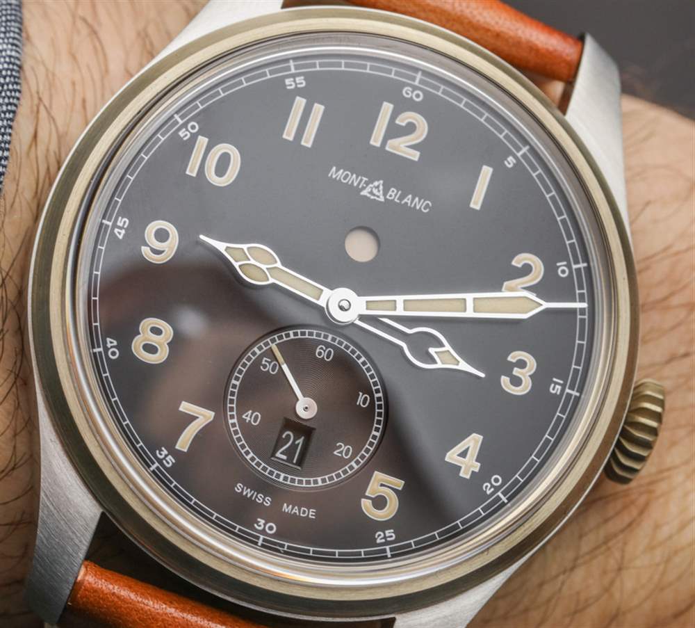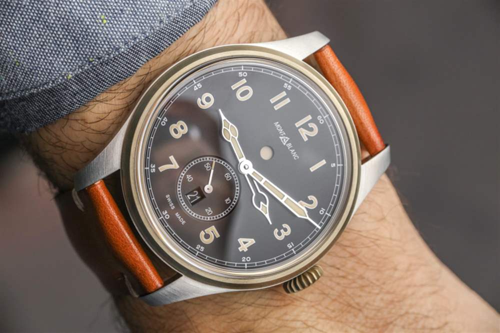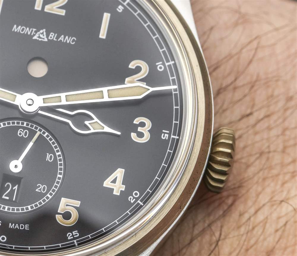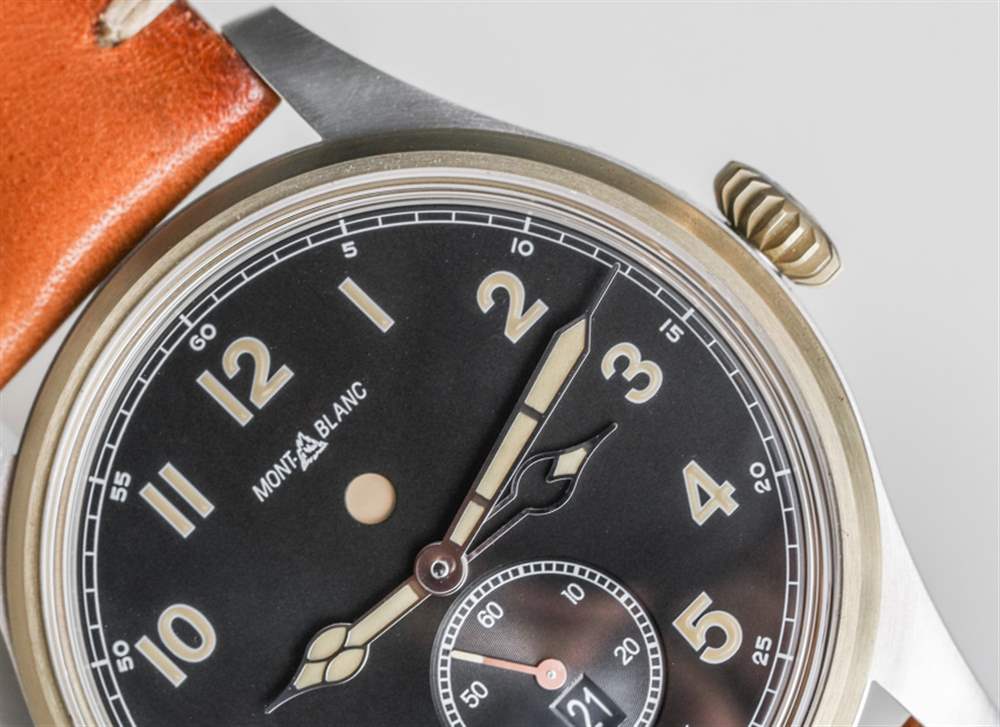 正如我所提到的,萬寶龍 1858 整體具有超清晰的表盤也很有幫助。再一次,它的設計以復古飛行員風格手表為主題,這意味著清晰的阿拉伯數字時標和易于閱讀的指針(時針和分針明顯區分)。指針和時標涂有“復古風格”(顏色)發光體。對于那些既想要現代佩戴體驗又想要經典外觀的人來說,像萬寶龍 1858 這樣的選擇是一個不錯的選擇。我還喜歡萬寶龍 1858 自動雙時腕表的原因是其標志比同類 1858 自動腕表(僅限時間的型號)要小一些。盡管這個標志是對歷史悠久的萬寶龍設計的直接模仿,但與萬寶龍更常見的現代企業標志相比,我并不是它的忠實粉絲。