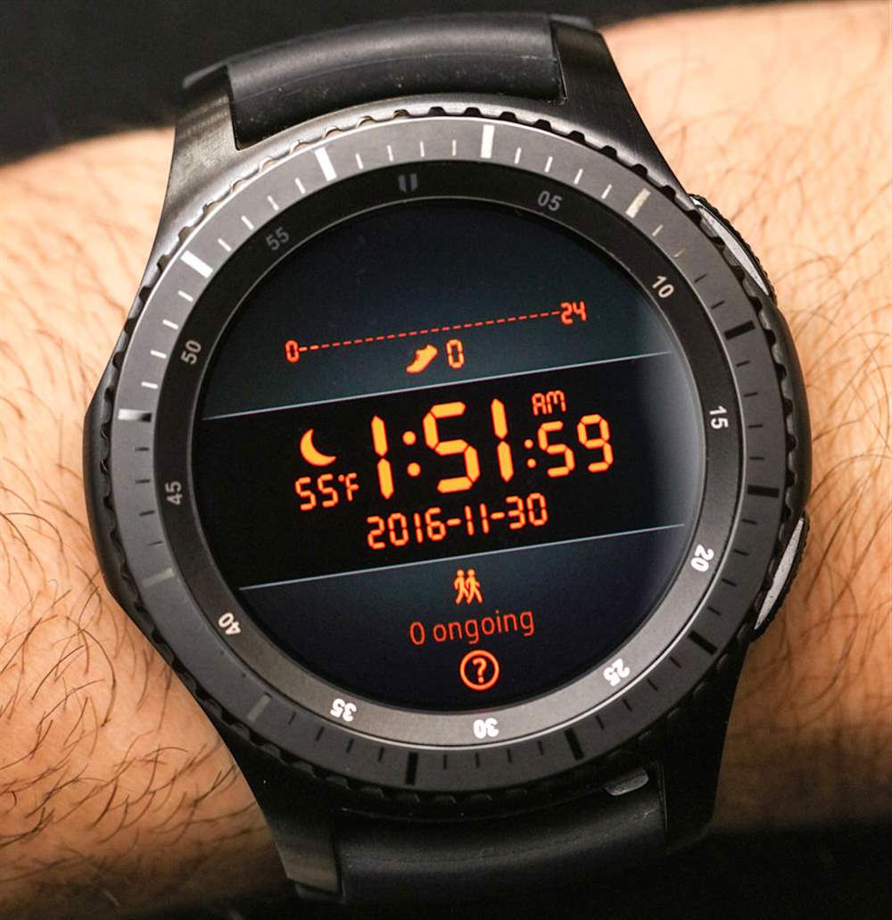 關鍵是位于三星 Gear S3 邊框中的單獨處理單元,它允許 OLED 屏幕具有特殊的常亮狀態,這與屏幕的正常“開啟狀態”不同。在之前的許多智能手表中,操作系統可以讓你一直保持屏幕開啟,但這對電池壽命來說是災難性的。奇怪的是,三星 Gear S3 并不容易找到打開和關閉常亮狀態的設置,而且它仍然警告你打開它對電池壽命真的很不利。