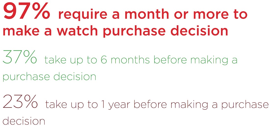 我認為可以肯定地說,aBlogtoWatchers 是聰明的消費者,他們會提前計劃他們想要的東西,并花時間等待合適的商品以合適的價格出現。30% 的人表示,在合適的機會出現之前,他們愿意等待購買他們想要的手表。此外,絕大多數 aBlogtoWatchers 并不認為手表是沖動購買。只有 4% 的人表示他們會花費長達一周的時間來決定購買自己想要的手表,而大多數人需要更長的時間才能與那件完美的手表建立關系。20% 的人需要長達一個月的時間才能做出購買決定,另外 37% 的人往往需要長達六個月的時間。23% 的人可能需要長達一年的時間才能做出購買手表的決定,而 17% 的人表示需要一年多的時間。