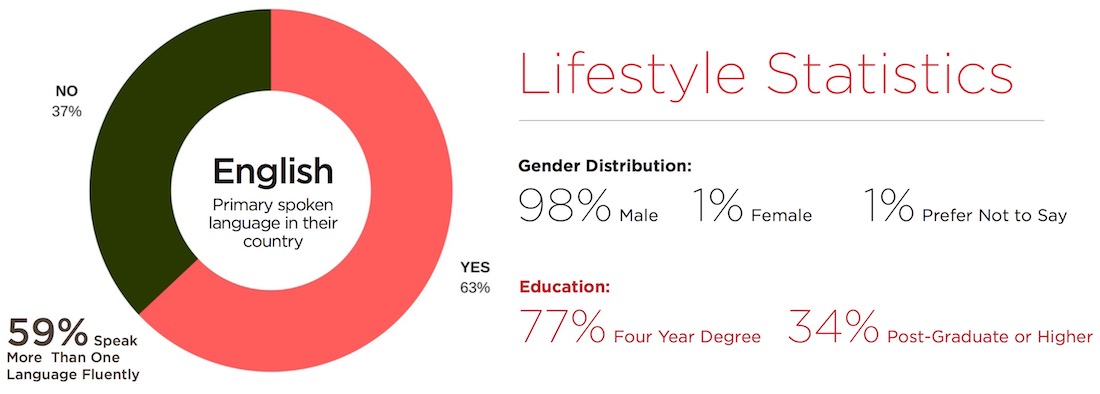 我們的原型“aBlogtoWatcher”是男性(大約 98% 的觀眾),年齡在 30-50 歲之間(超過 58% 屬于這一類)已婚(59%),但生育孩子的可能性略低(52 % 不)。這可能意味著他的生活更加穩定,而且他的可支配收入往往比很多人都多。稍后會詳細介紹。教育是他引以為豪的事情,因為他擁有四年制學位、研究生甚至博士學位(共占觀眾的 77%)。他的教育不僅僅是正規的。他是一個非常世俗的人,因為他不僅可能會說一種以上的語言(59% 會),而且還會定期出國旅行(69%)。他甚至很有可能住在他長大以外的地方(54%),并且可能擁有他住的房子(63%)。