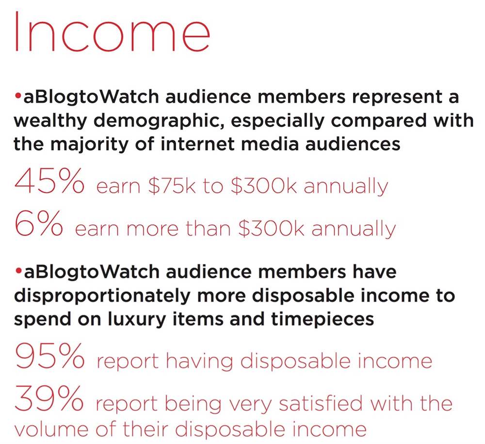 aBlogtoWatchers 代表了比一般人多得多的人群,他們在管理部門、獨資或聯合企業所有者、或僅僅是獨立富有的人中獲得報酬(占受訪者的 46%)。如果他們更年輕(25 歲以下),幾乎所有人都在接受教育和上學——可能注定要走類似的人生道路。無論他們的工作或職業如何,aBlogtoWatch 人通常都很富裕。其中超過 1% 的人代表“那 1%”,而且幾乎所有 aBlogtoWatchers 都有可支配收入(95%)。盡管有一些相當昂貴的購買習慣,他甚至很有可能對自己的可支配收入非常滿意并且不想要更多(39% 的人對他們的可支配收入感到滿意)。