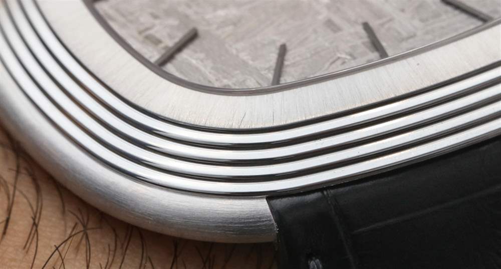 伯爵傾向于用細針式拋光指針制作光面表盤。這種閃閃發光的組合營造出優雅的外觀,但當暴露在……光之類的東西下時,易讀性真的會受到影響。白色隕石的磨砂表面與黑色指針和時標混合在一起,形成完美的對比,使易讀性和風格和諧地保持完好。這是伯爵最幸福的時刻,我真的希望這種表盤設計能在未來出現在更多手表中,比如 Altiplano 系列中的手表。