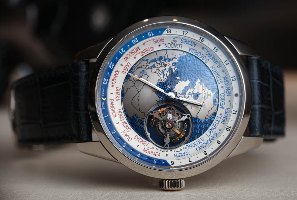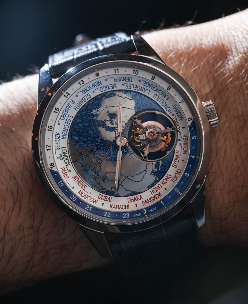 Jaeger-LeCoultre 地球物理世界時陀飛輪腕表在圖像上看起來很整潔,但您需要看到這款腕表在運行中才能欣賞它。首先是 43.5 毫米寬的豪華實心鉑金表殼。它戴在手腕上很舒適,而且明顯比 Geophysic 系列的其他產品更引人注目——尤其是三手型號。當然,Jaeger-LeCoultre 地球物理世界時陀飛輪建立在標準地球物理世界時(此處動手實踐)之上,這是一個以手表書呆子為主題的自制自動機芯與“真秒”滴答作響的巧妙組合秒針和世界時間指示器。廣告訊息廣告信息結束