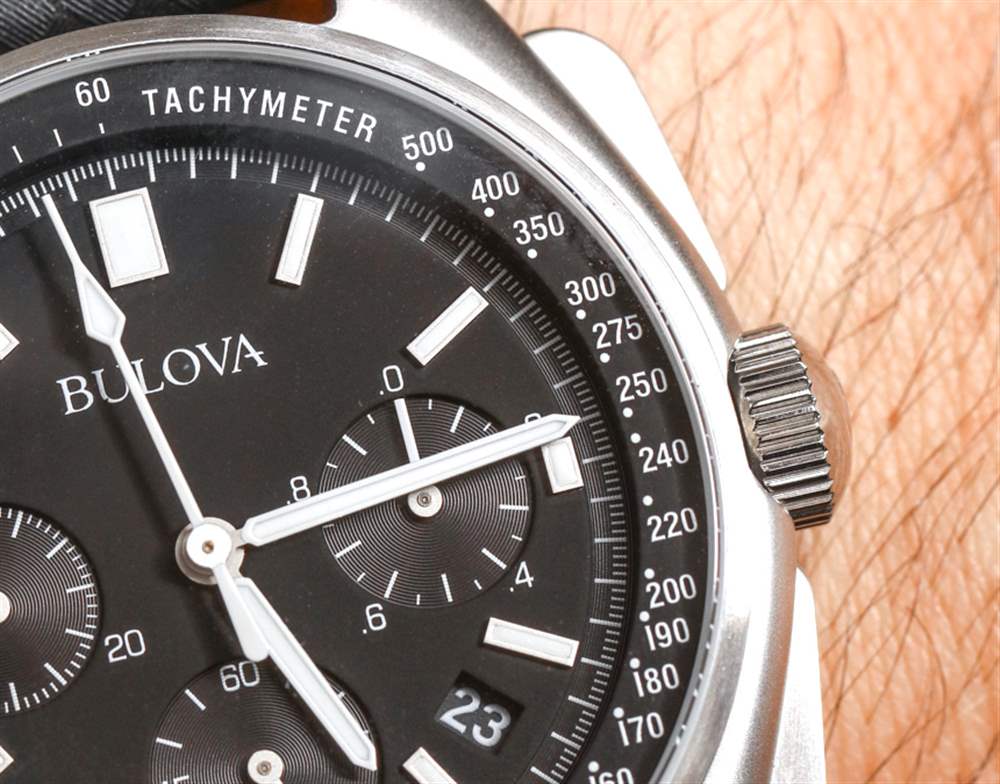 Bulova Moon Chronograph 手表寬 45 毫米,厚 13.5 毫米(防水 50 米),偏大,這可能是人們購買手表的主要關注點。尺寸并不困擾我,因為表耳很粗,手表佩戴起來非常舒適。但是,如果您擔心尺寸,您應該先嘗試一個。在我看來,鋼制表殼的渲染非常好,尤其是因為它看起來并不乏味。
