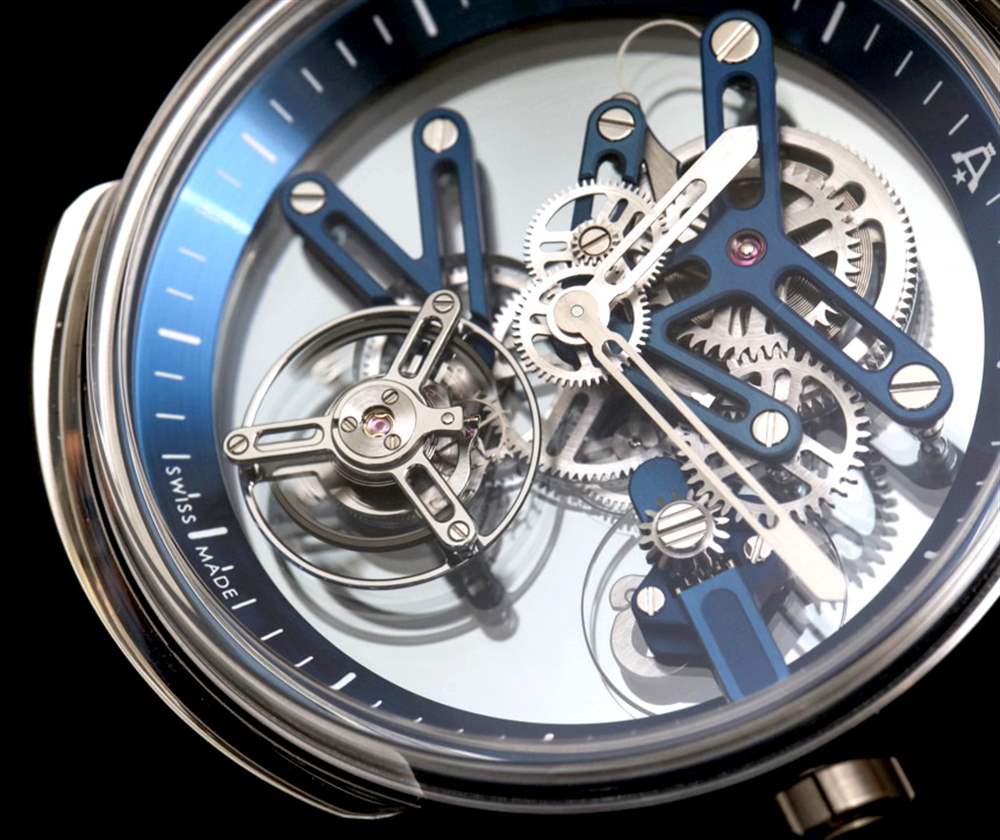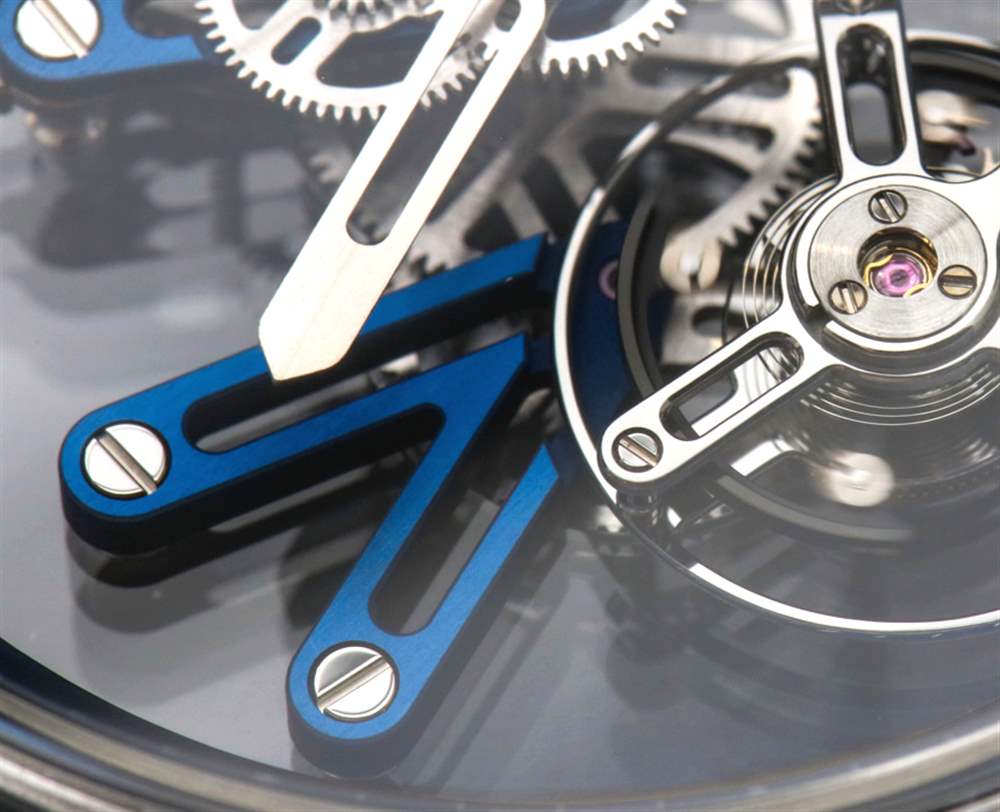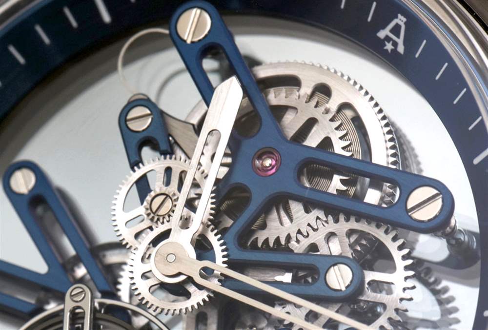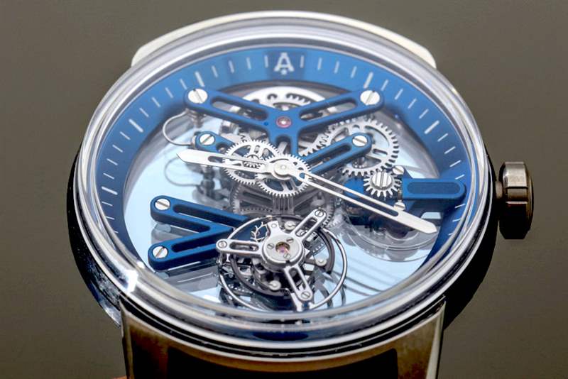 Angelus U20 Ultra-Skeleton Tourbillon 的 A-250 機芯(似乎幾乎不存在)是各種迷人的透明藍寶石水晶板,可將所有東西保持在一起,藍鈦橋板。其他材料,如鍍黃銅、鋼和金用于機芯的其余部分。從功能上講,機芯不僅指示時間,還包括飛行陀飛輪——因為“為什么不呢?”