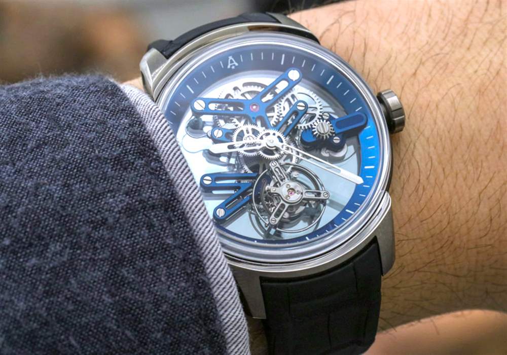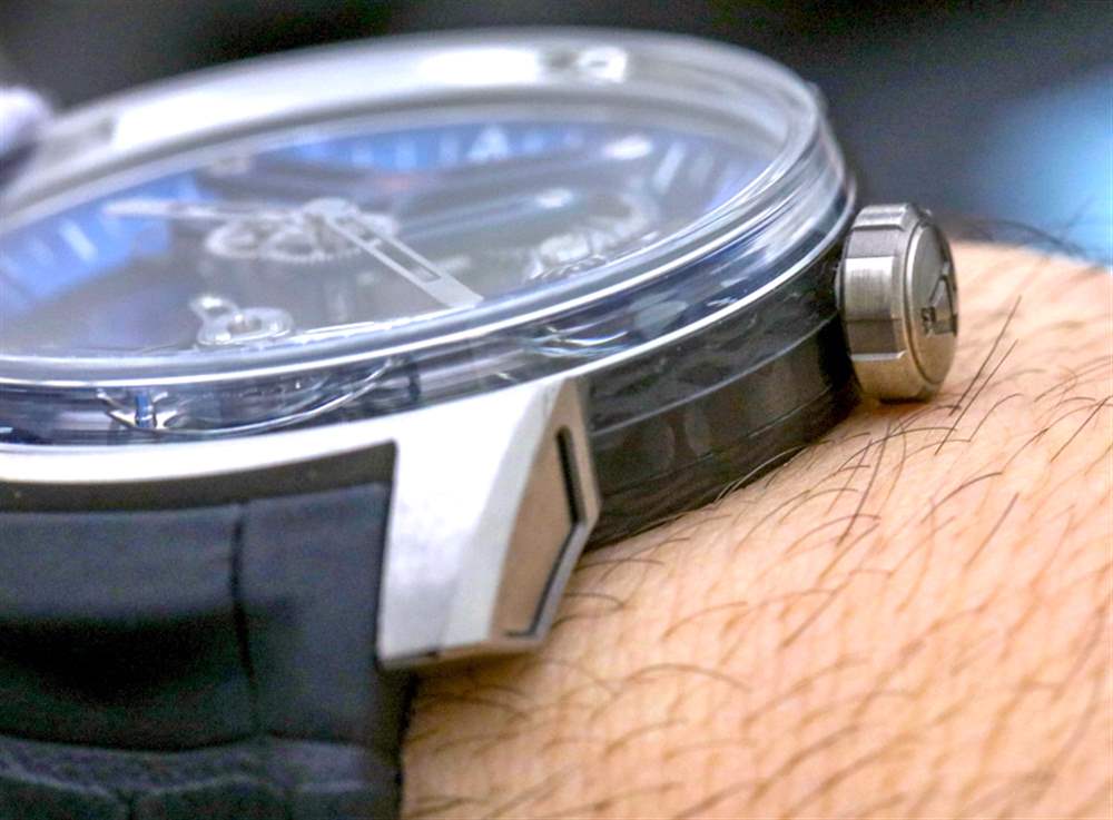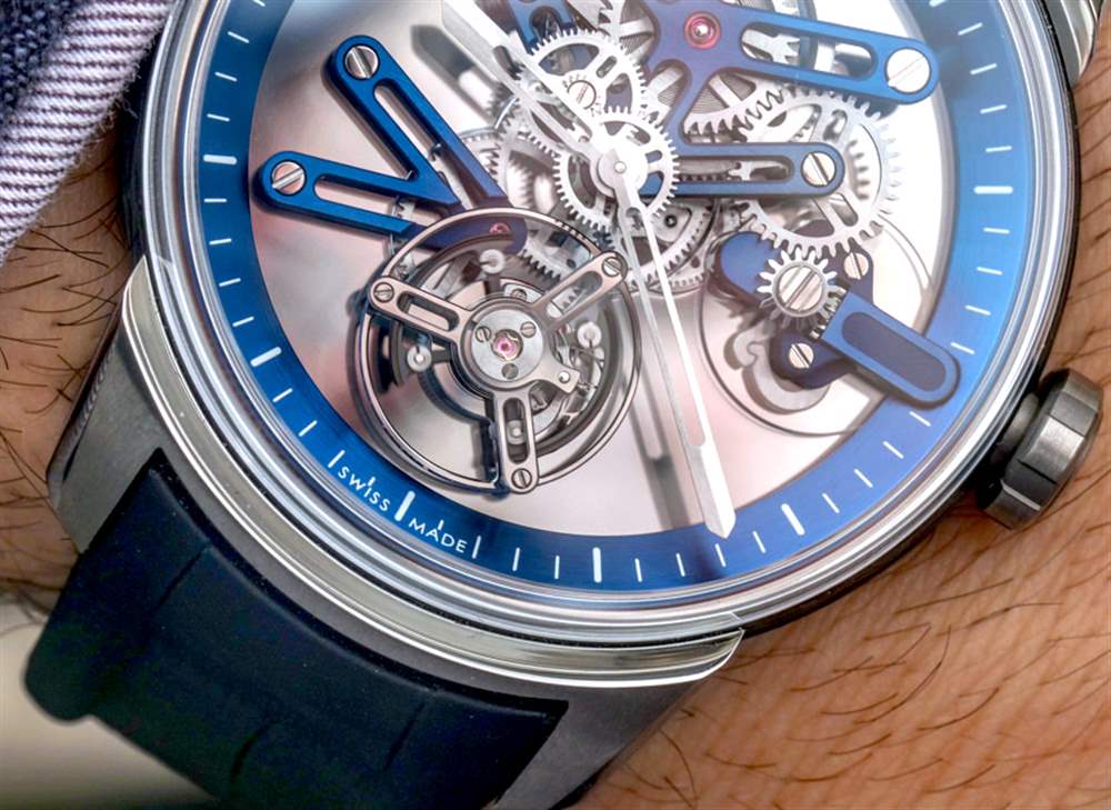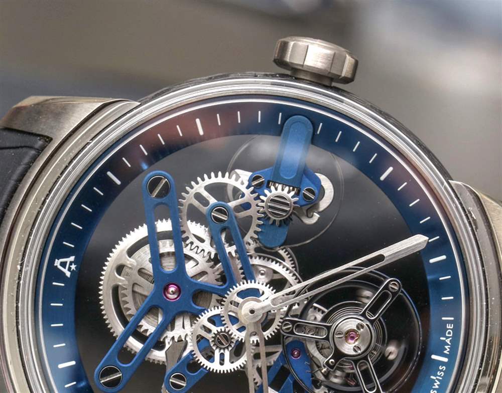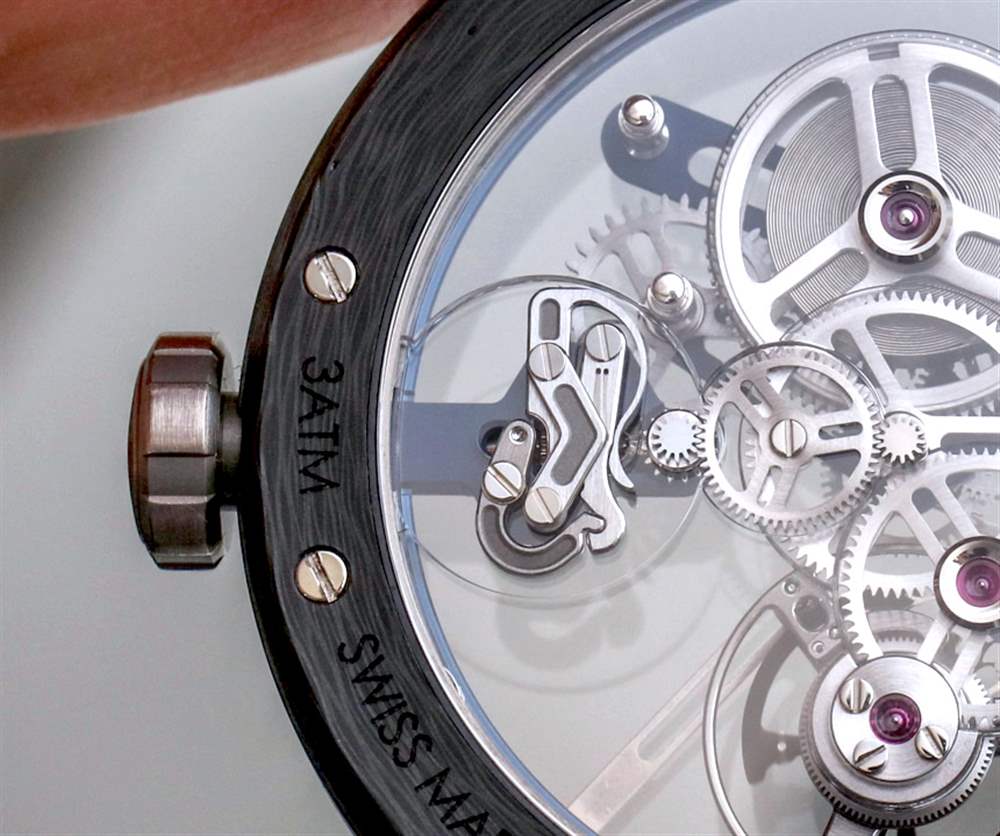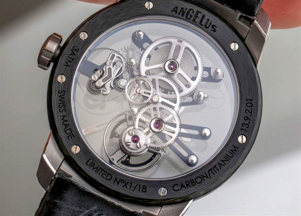 我最喜歡的是美學精致和專注于機械元素的結合,這些元素吸引了我們看書呆子的最深處。同樣,這一切都要感謝塞巴斯蒂安。Angelus U20 Ultra-Skeleton Tourbillon 旨在成為非?,F代的陀飛輪應有的典范,同時為機芯提供卓越的可見性。我現在應該注意到,有兩個版本的手表可用——這個事實很容易被忽略。不同之處在于一個使用完全透明的藍寶石水晶底蓋,而另一個使用半透明的“單向鏡”式底蓋。