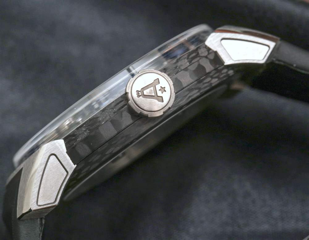 U20 表殼和 calibre A-250 機芯的重點是為機芯提供卓越的可視性。出于這個原因,Angelus決定稱它為“超骷髏”。首先是 42 毫米寬(僅 10.3 毫米厚)的表殼,其前后均使用“盒子式”圓頂藍寶石水晶。夾在中間的是黑色 NPT 碳纖維和鈦。防水深度為 30 米。這顯然是一個在美學和材料上都非常現代的設計。