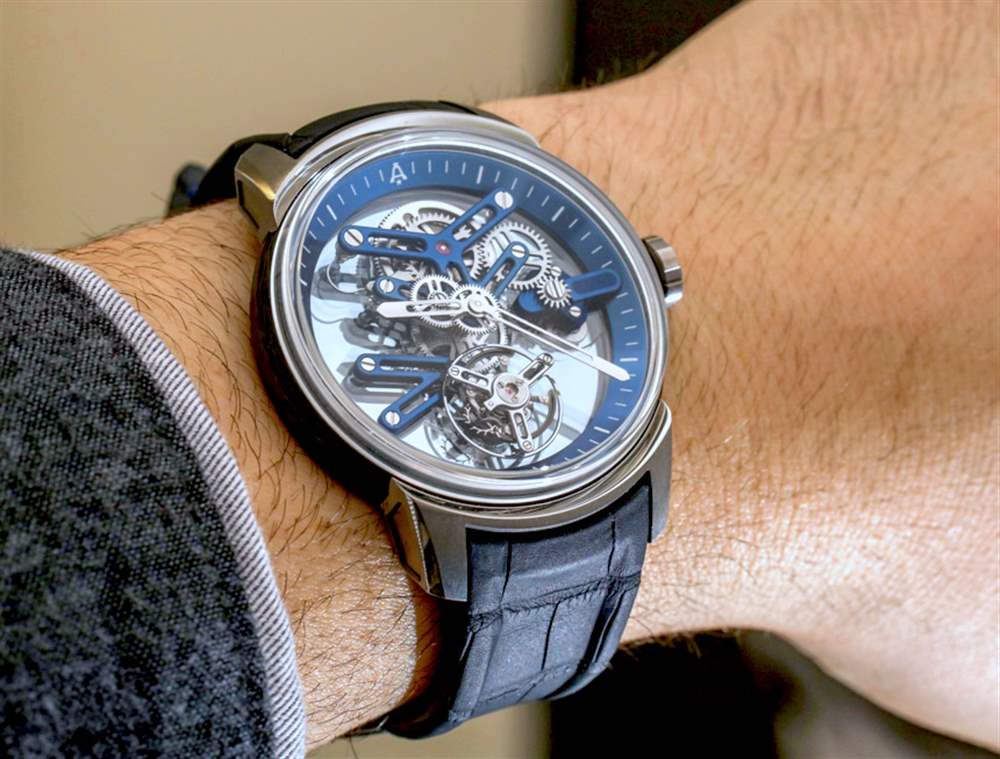 在手腕上,碳纖維、藍寶石水晶和鈦金屬表殼既輕巧又合身,佩戴舒適。附在表殼上的是一條黑色“隱形”鱷魚皮表帶,帶有鈦扣。整個設計感覺就像是現代和傳統元素的成功結合,具有許多視覺效果,但具有永恒的吸引力。我很樂意每天佩戴其中一款 Angelus U20 Ultra-Skeleton Tourbillon 手表,如果只是為了接受佩戴它可能會受到的所有關注。這是我不介意觀看書呆子對話的手表類型。