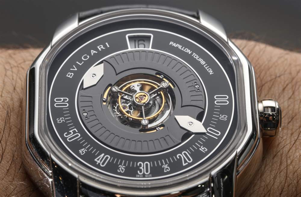我一直提到 Urwerk 的原因是,雖然 Bulgari Papillon Tourbillon Central 的功能不同,但分針的操作有點相似。正如我之前所說,這不是第一款 Papillon 手表,因為它早于表盤上的寶格麗名稱,但這是我第一次記得它被移動到表盤外圍而不是正確的在中心。