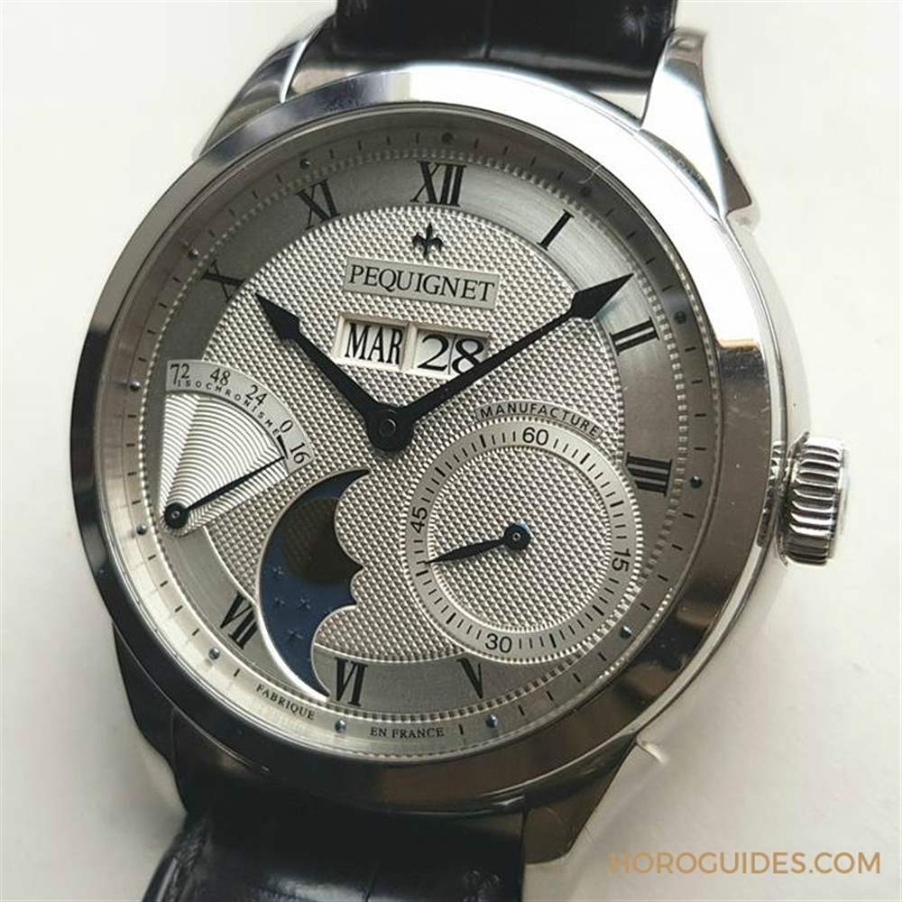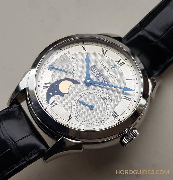 沒有太多人認識的法國品牌,機能性蠻強,面盤布局有特色,機刻雕紋,尤其直立式月相盤。機芯不是頂高級,但也屬于中上水準的專用機種,有JLC, Zenith的等級,拋磨修飾有到位。雙向自動上鏈,慣性螺絲微調擺輪(以4顆螺絲微調走時快慢) ,3日動力儲備。品牌經營有些問題,卻也是入手的好時機。