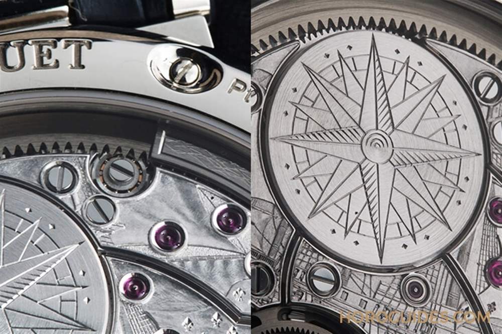 發(fā)條盒蓋上雕刻的是風向玫瑰圖案的羅盤,發(fā)條盒邊緣看得到環(huán)型自動盤上鏈的輪齒。