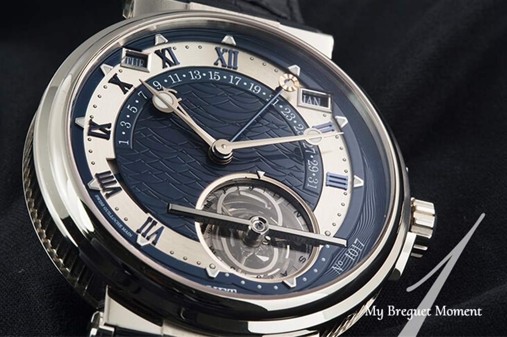 高級表重視的就是細節(jié),每一處零件都經過精心的打磨、鐫刻,而寶璣絕對是這方面的專家。5887表盤特殊的手工鐫刻,是專門為這只表設計的波狀紋理,搭配藍色的金質表盤相當呼應表款的航海淵源。表盤上各區(qū)塊也各有不同的裝飾細節(jié),羅馬數字時標圈是霧面拉絲打磨,表盤最外圍則還有波浪狀的雕飾。