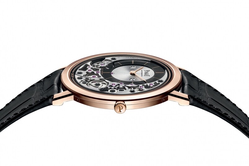 要制作一枚如此纖薄的腕表,內部的結構當然是更加難造,無論是組件的大小以至組件的結構編排,都是一大難題。例如部分零件與頭發厚度不相伯仲,某些擺輪僅厚0.12mm ,而傳統機芯擺輪厚0.20mm,不要看少這0.08mm,背后所需的技術是難以想像的。而他們也在極細空間中,在表盤上裝嵌以單一表橋支撐的懸浮式發條盒,有別于一般裝嵌在主夾板上的發條盒。而擺陀方面,更巧妙地于機芯外圍,與機芯厚度融為一體,達致整體的纖薄效果。其22K金的物料為機芯擺陀帶來穩定堅固的結構,亦同時搭配黑色PVD涂層,令人想不到的是,Altiplano Ultimate Automatic竟然有50小時動力儲存!
