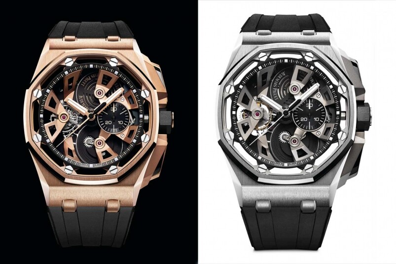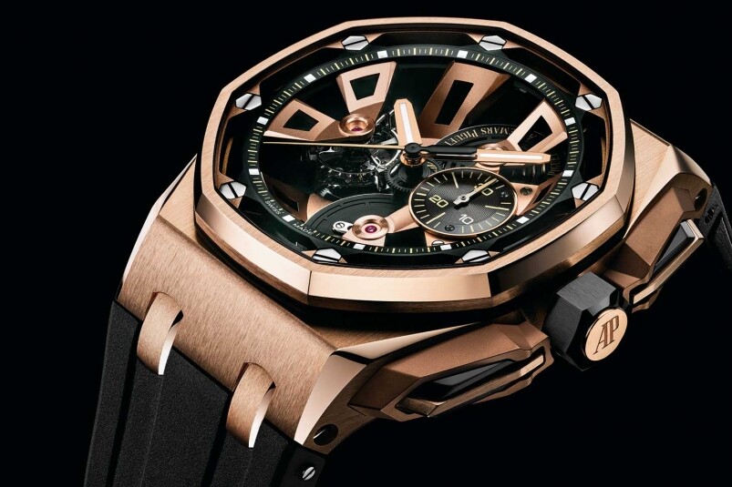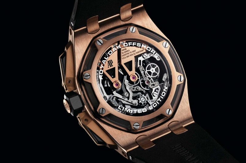 如果要形容這全新的Royal Oak Offshore Tourbillon Chronograph,我會形容為充滿未來感及建筑結構感,看進去表盤的設計,你可以感到猶如一座未來建筑的微縮結構似的。必須留意的是,AP經典的八角鏍絲仍然都在,但卻放在藍寶石玻璃之下,不再只是為了固定表圈而設,卻是直透機芯,將機芯部件固定,將結構從表面一直延伸至心臟,與其他的Royal Oak Offshore大有不同!