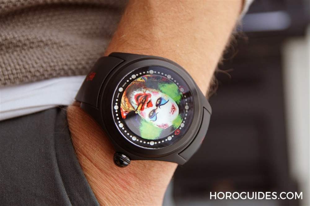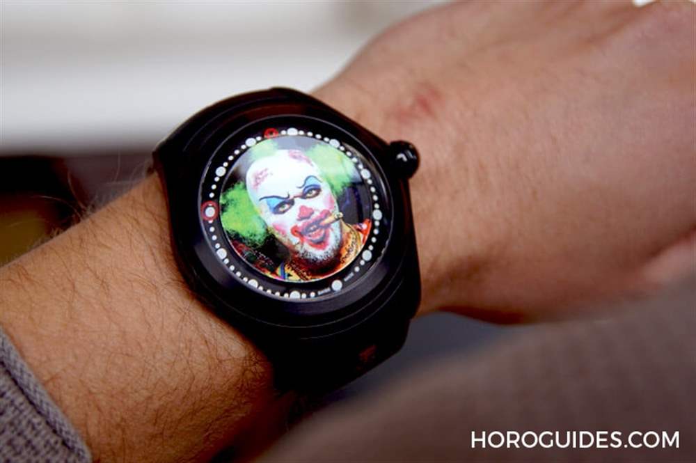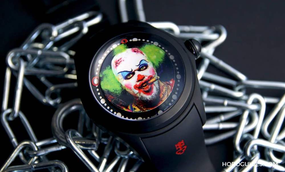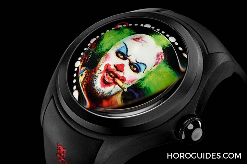 為了不遮擋到表盤上的小丑畫(huà)作以及大曲面表靜戲劇性的放大效果,Bubble Clown小丑腕表沒(méi)有指針指示時(shí)間,而是以表盤外緣上的兩個(gè)紅圈來(lái)代表小時(shí)以及分鐘。